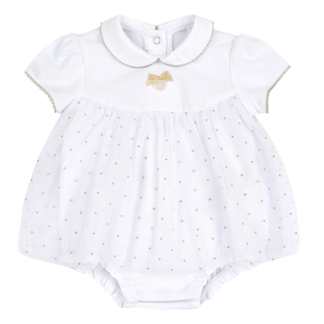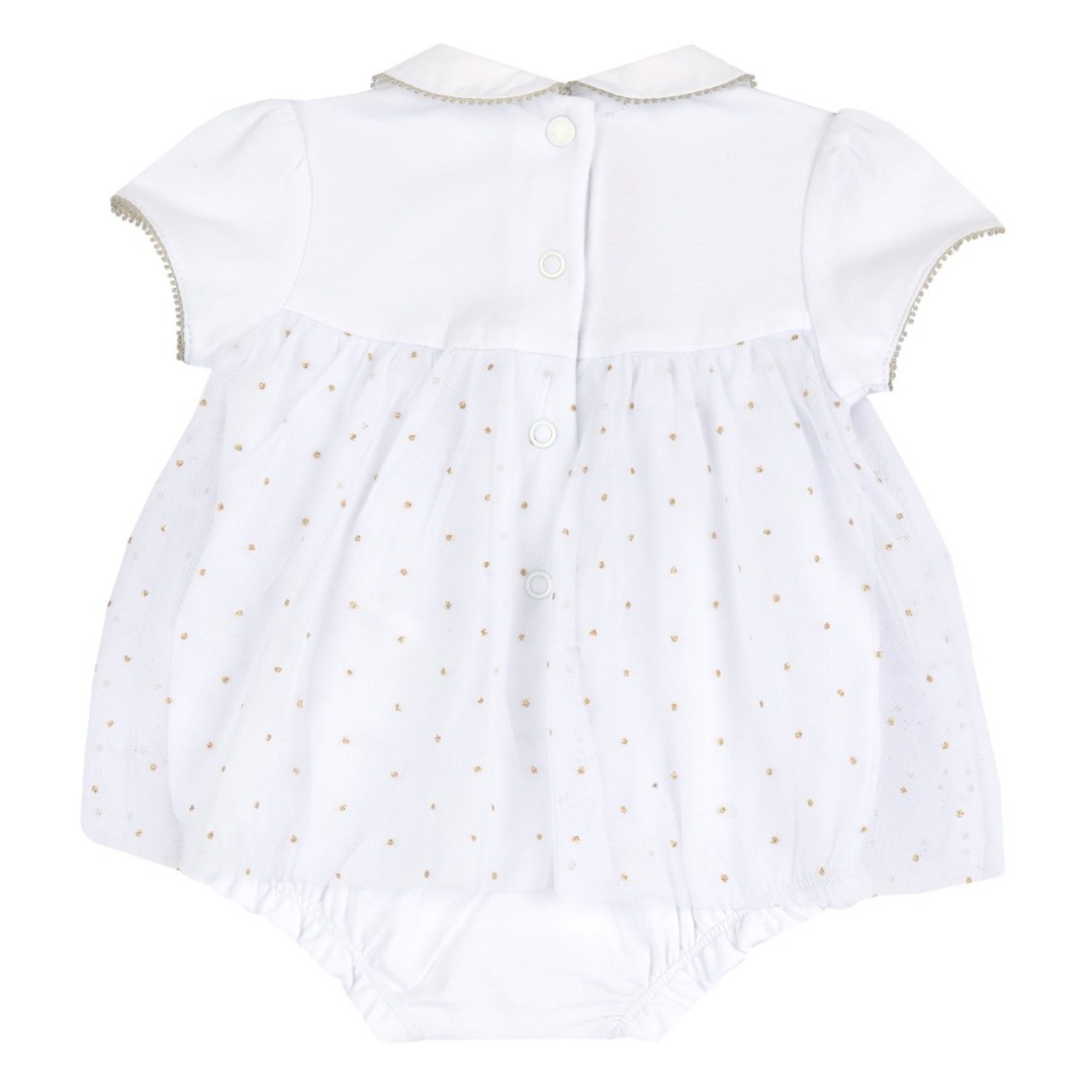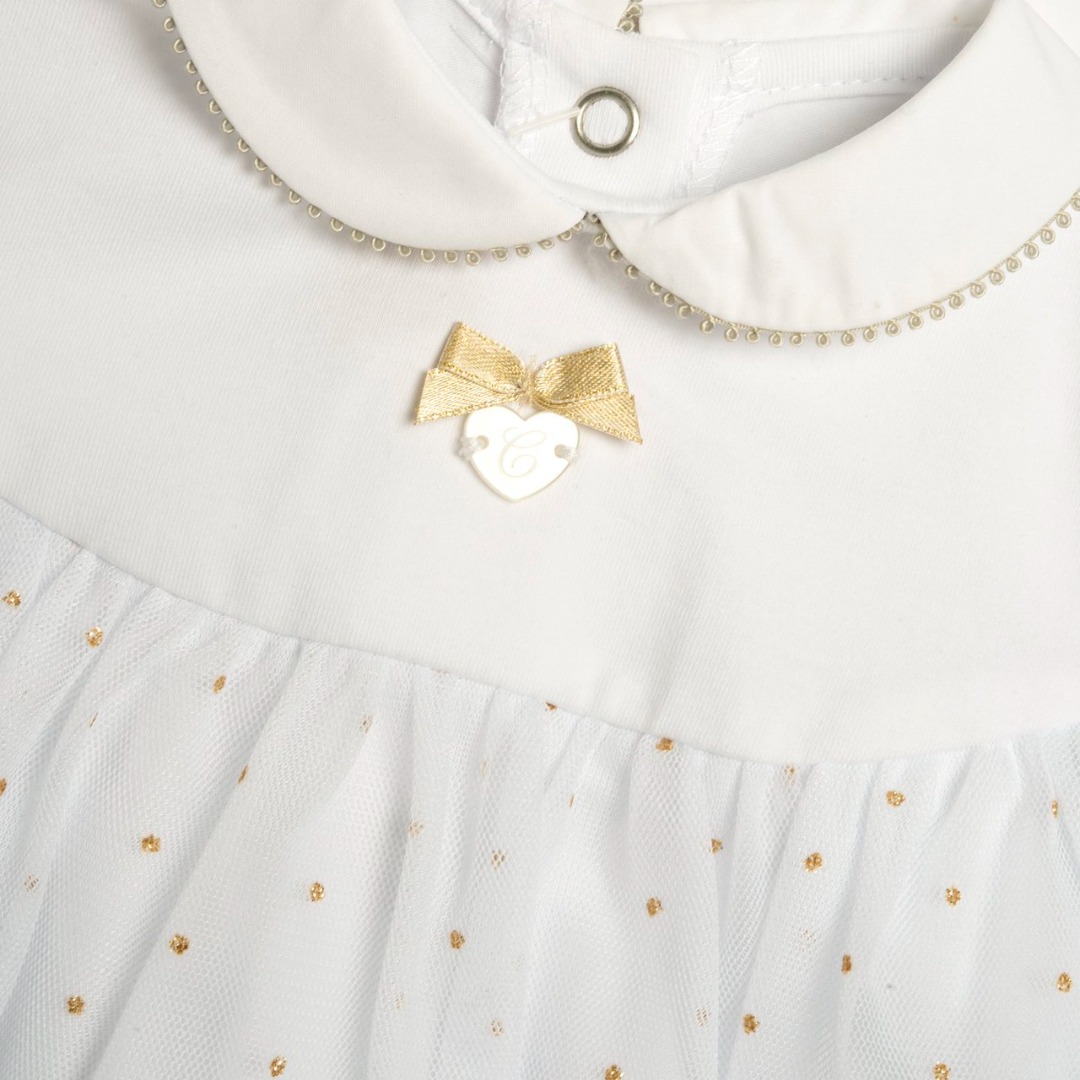 Vestito a maniche corte in tessuto leggero per bambina di colore bianco con stampa a pois glitter. Collo baby in cotone, ha l’applicazione di un fiocchetto e cuoricino in madre perla sul petto, e una gonna in tulle a strati. Apertura dietro e interno gamba con bottoni automatici.