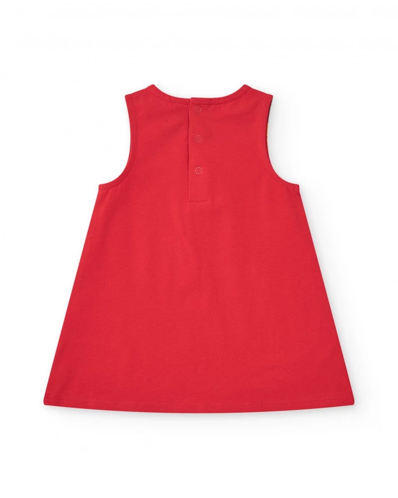 Vestito per bambina senza maniche rosso, con stampa floreale multicolore sul petto. Chiusura a bottone sulla parte posteriore per facilitare la vestizione.