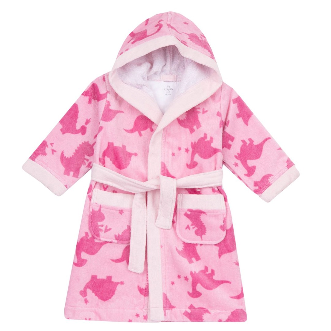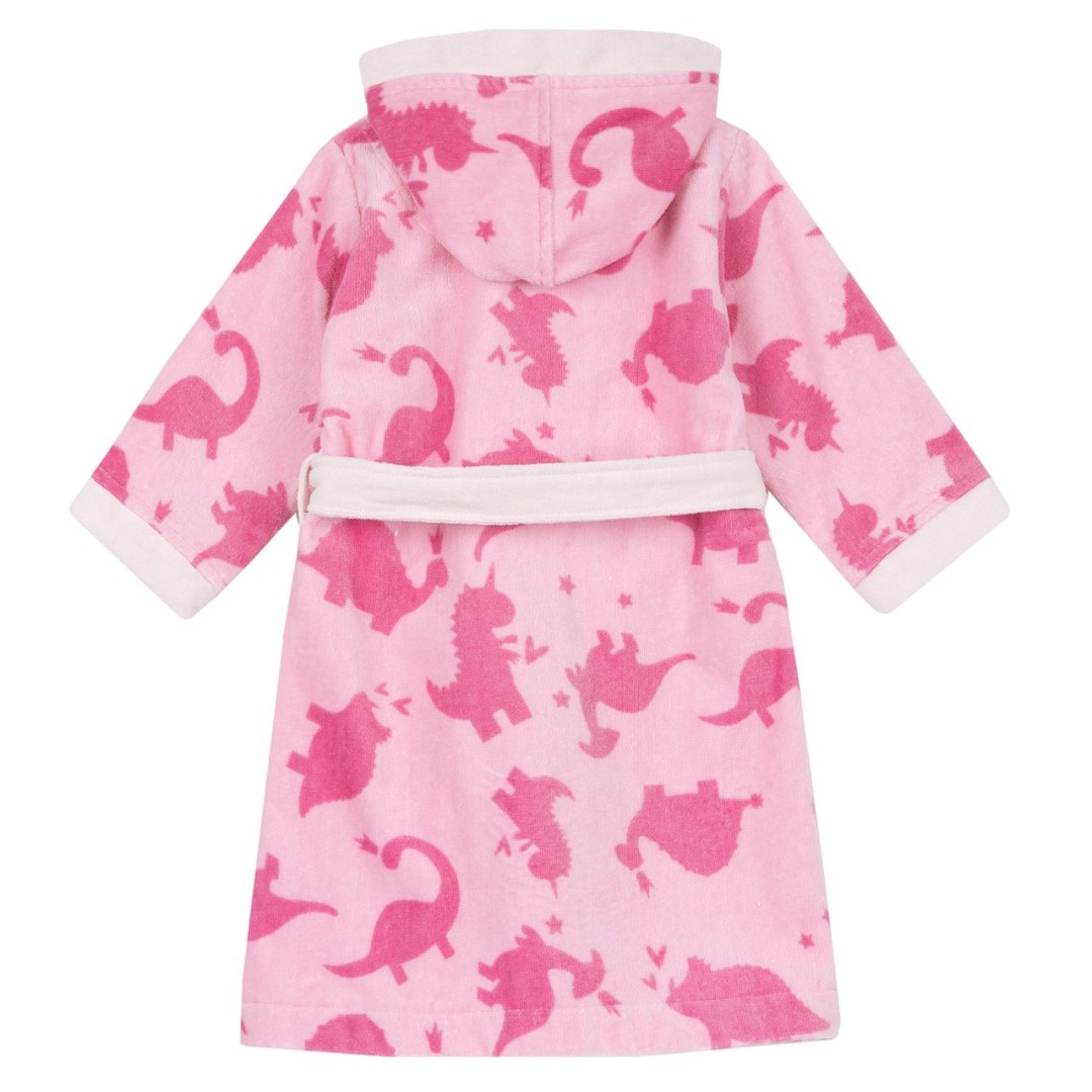 Accappatoio stampa fantasia in spugna di cotone stampa fantasia dinosauri nei toni del fuxia.