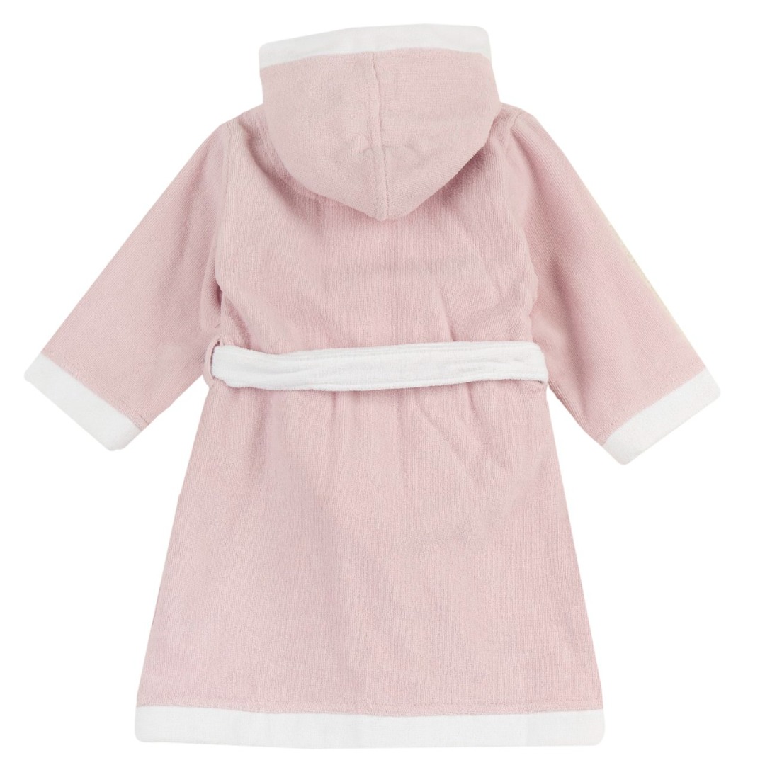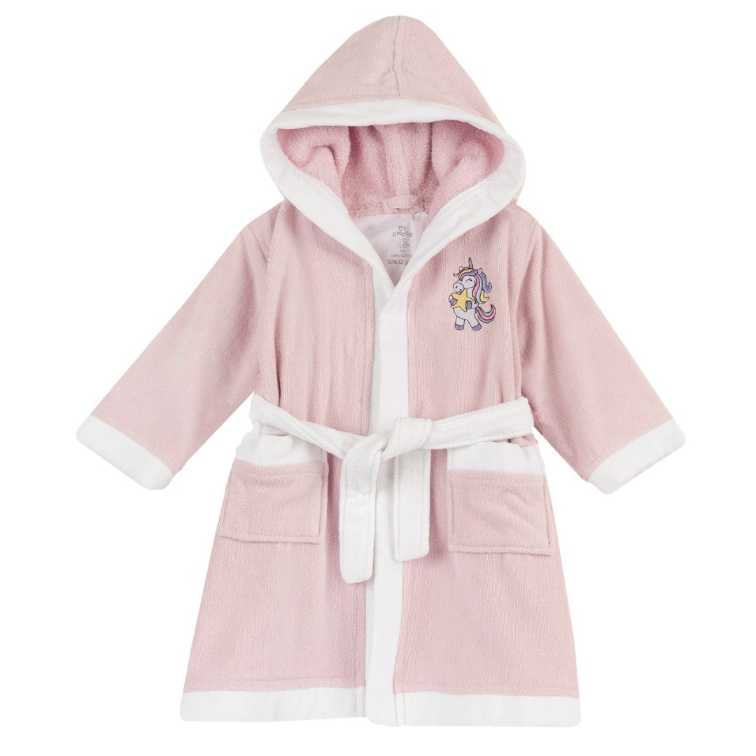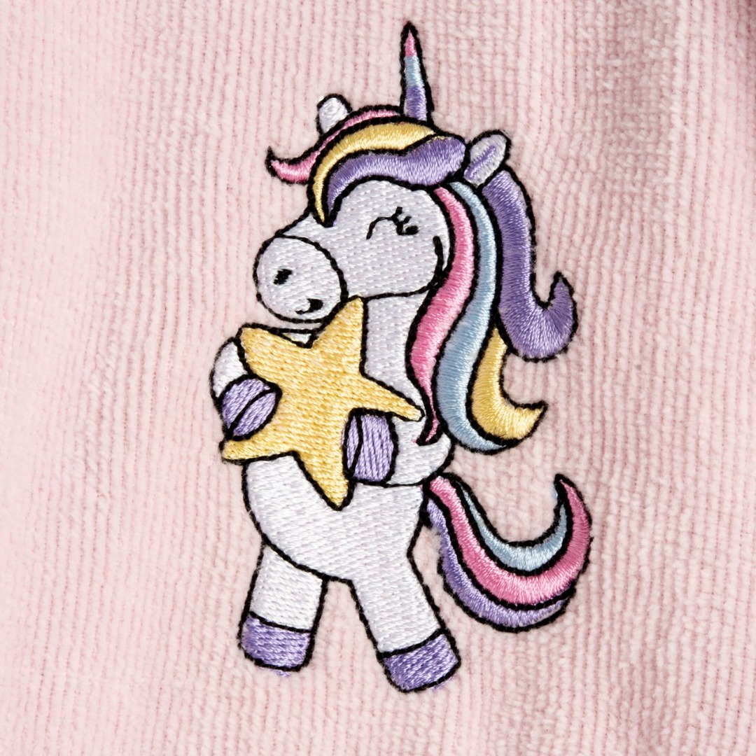 Accappatoio per bambina in spugna di cotone rosa con ricamo di un unicorno. Tasche applicate davanti, cintura e bordi in colore a contrasto bianco.