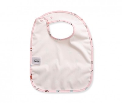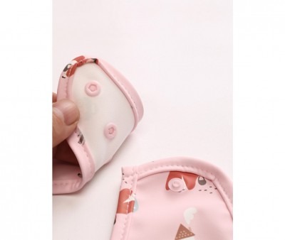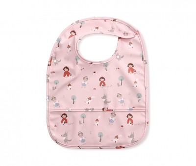La tasca frontale raccogli briciole aiuta a mantenere puliti i vestiti, mentre la chiusura a scatto regolabile permette di adattarlo alla crescita del bambino.
