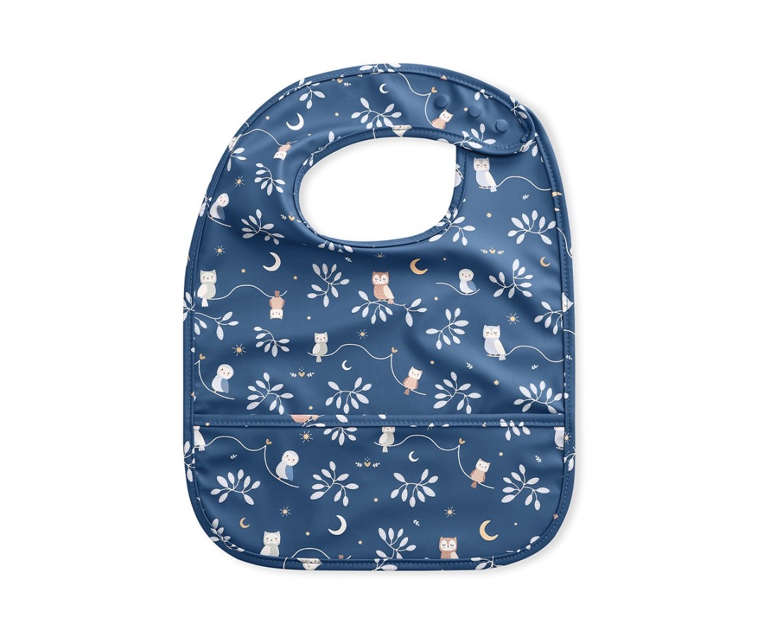 La tasca frontale raccogli briciole aiuta a mantenere puliti i vestiti, mentre la chiusura a scatto regolabile permette di adattarlo alla crescita del bambino.