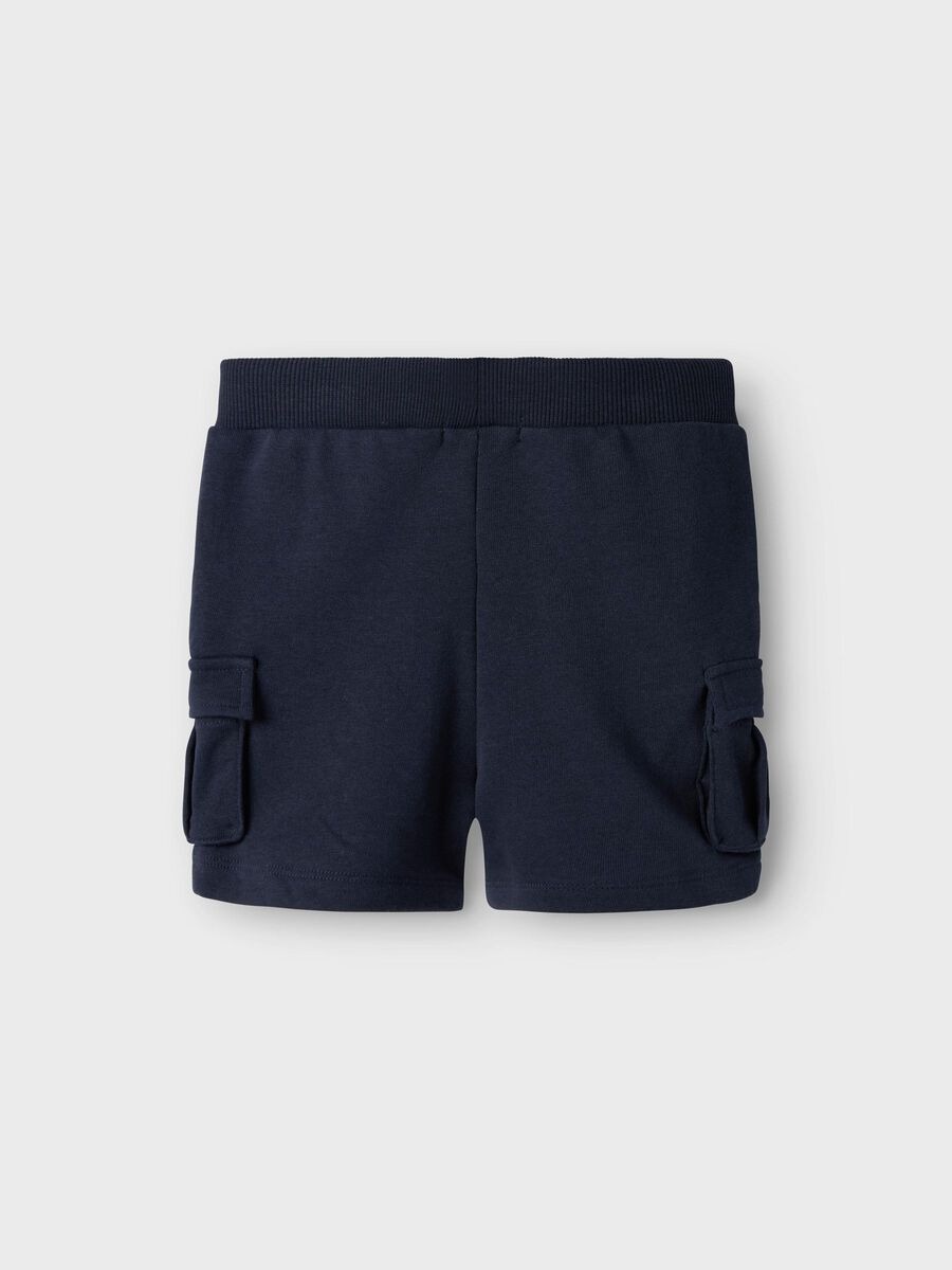 Bermuda da bambino in tessuto felpato non garzato di colore blu con pratiche tasche laterali. Elastico in vita con cordino regolabile per una sensazione di comfort.