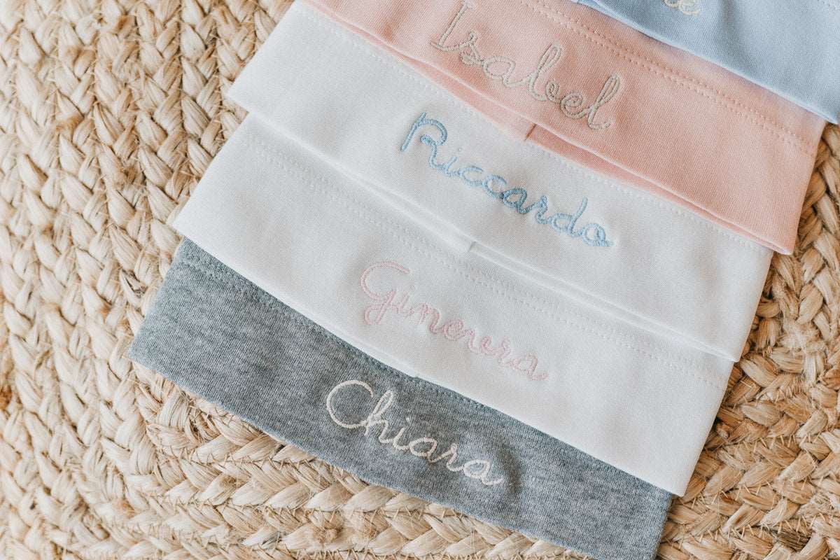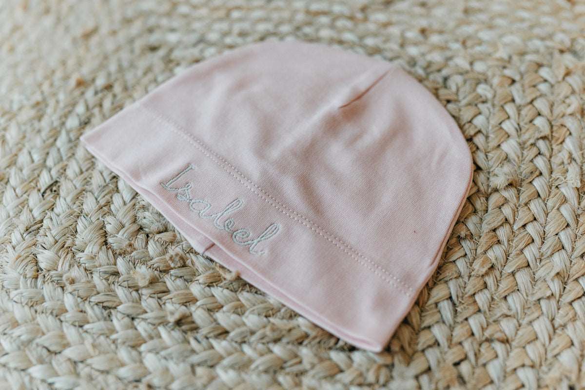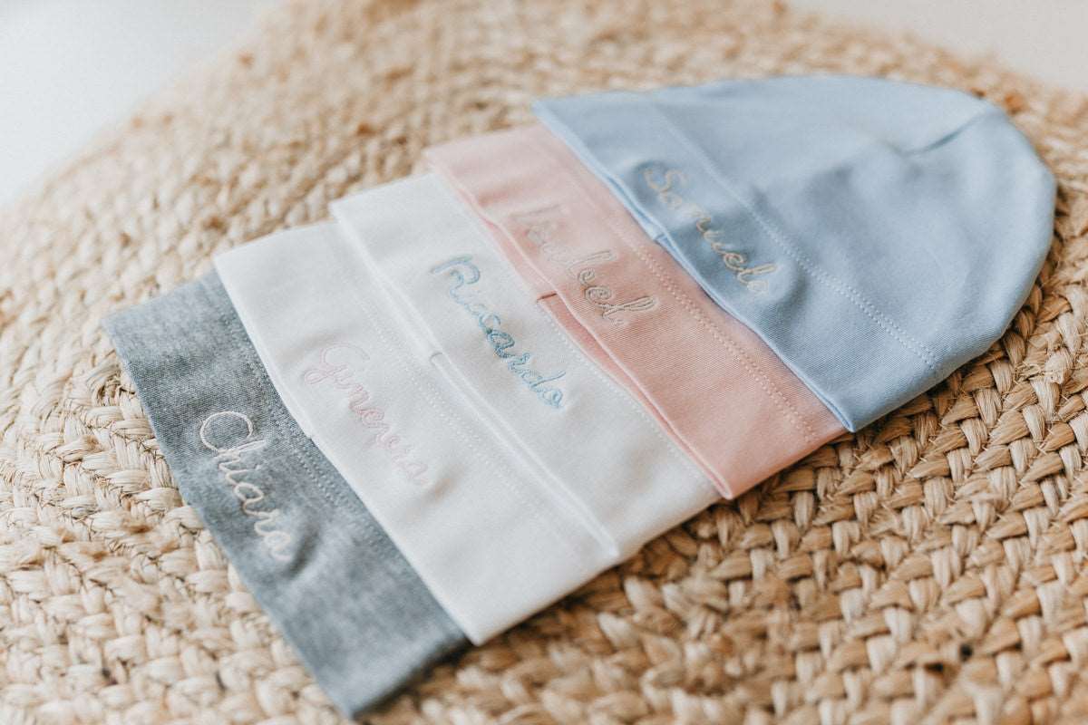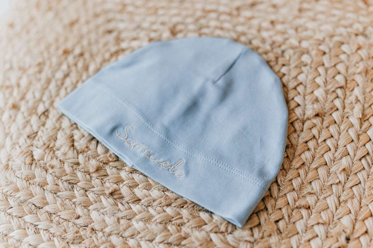 ARTICOLO RICAMATO Cappellino da neonato in 100% cotone con ampio risvolto in taglia unica (0-12 mesi) personalizzato con il nome del bambino.