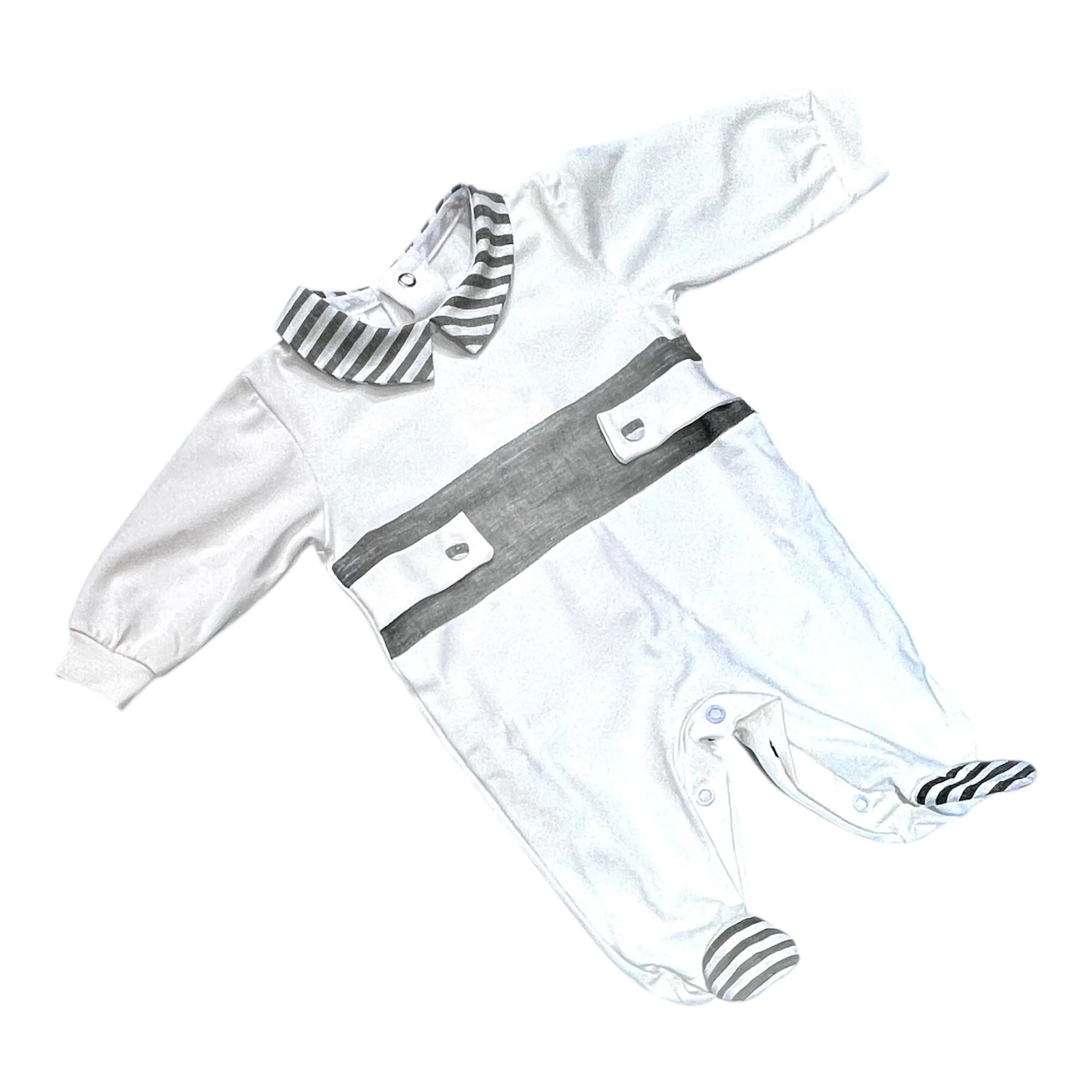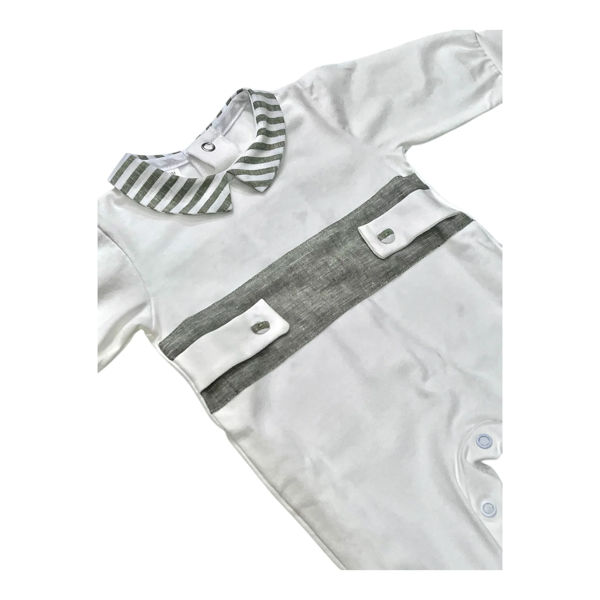 Tutina in cotone 100% naturale, ideale per il corredino del neonato. Realizzata con fibre delicate e traspiranti, garantisce il massimo comfort durante le prime settimane di vita. Il design pratico con chiusure facilitate consente cambi rapidi e indolori. Perfetta per la pelle sensibile del bambino, questa tutina combina morbidezza e durabilità, mantenendo la forma anche dopo numerosi lavaggi. Un capo essenziale e versatile per ogni momento della giornata.