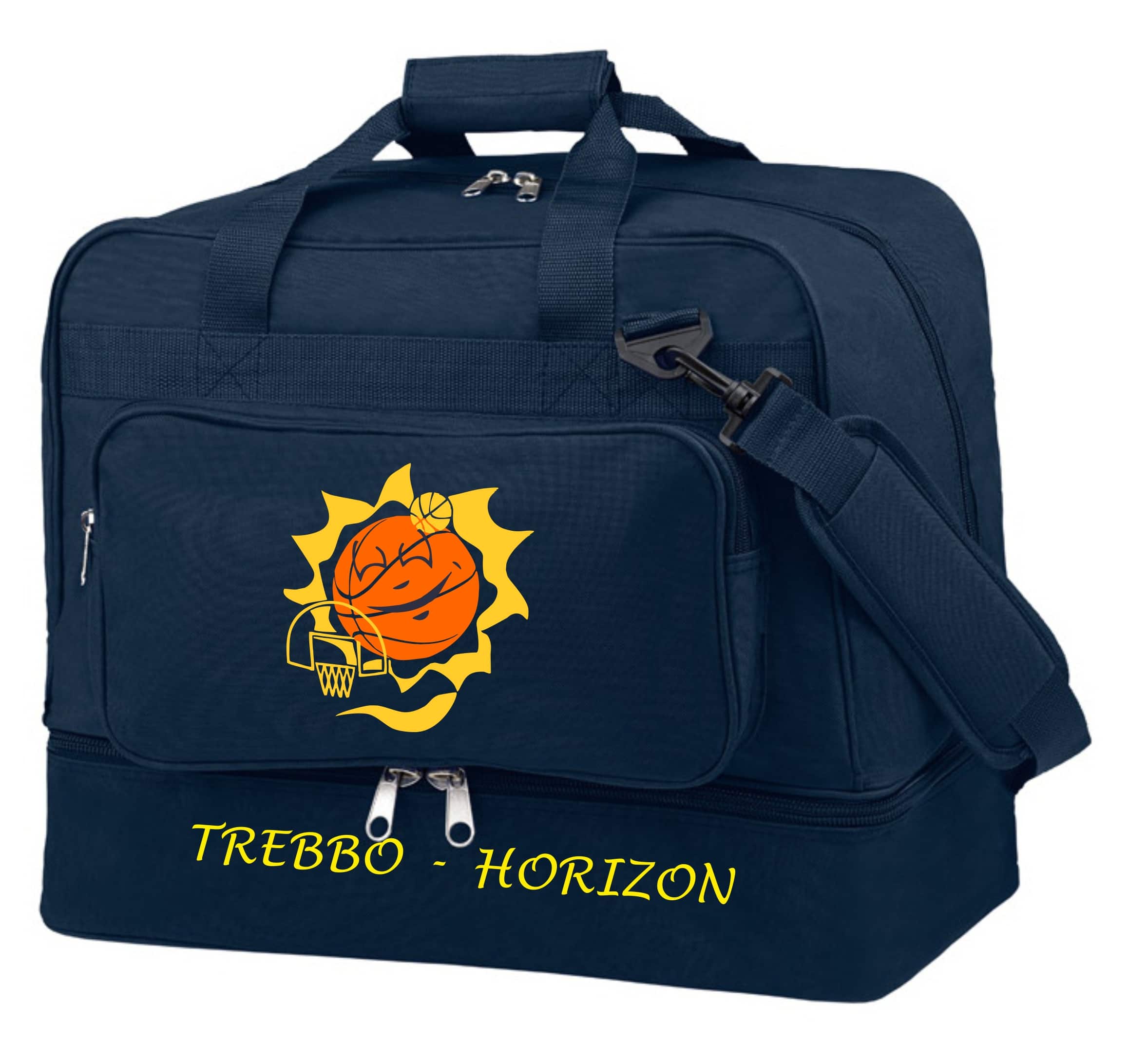 Borsa sport con doppio fondo e tracolla diagonale,una tasca,portanome,fondo nero con piedini in ABS. Vasca portascarpe rigida Misura 50x42x30 Stampa a caldo