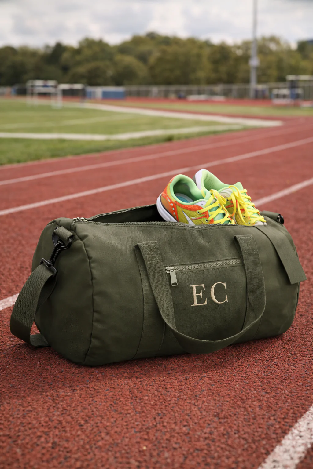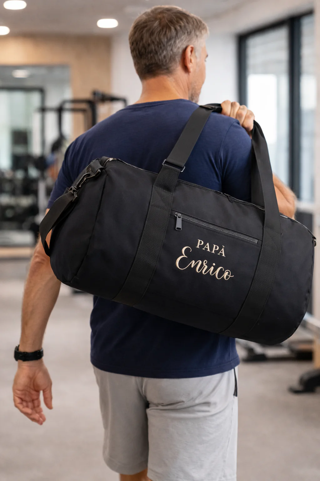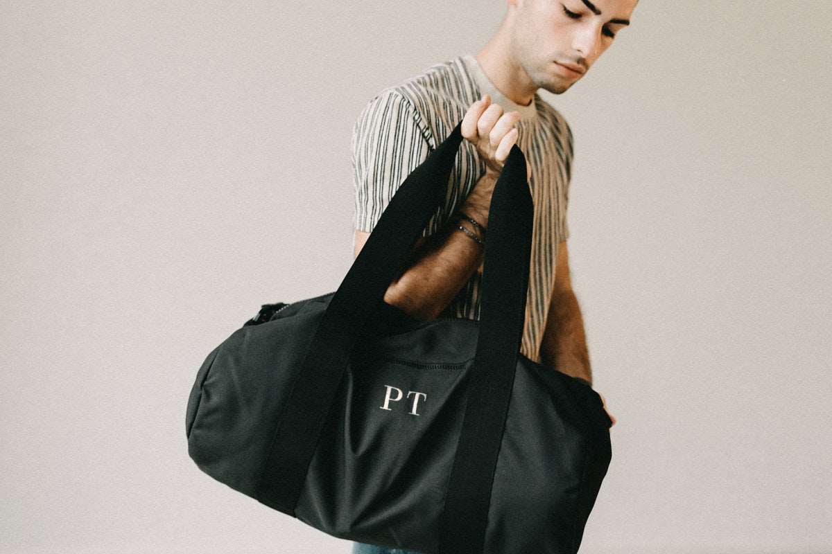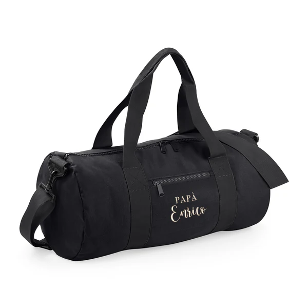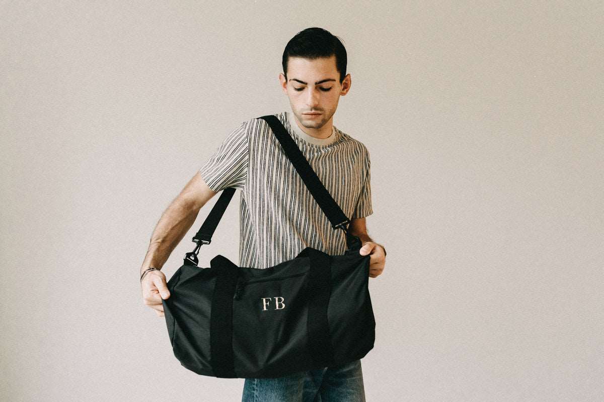 Borsone con ricamo personalizzato delle iniziali: ecologico, da viaggio, per la palestra e il tempo libero. Realizzato in 100% poliestere riciclato. E’ leggero ma resistente realizzata con tasca centrale con cerniera e puรฒ essere trasporta con tracolla o maniglie. Capacitร : 20 litri -Dimensioni: 50 x 25 x 25 cm