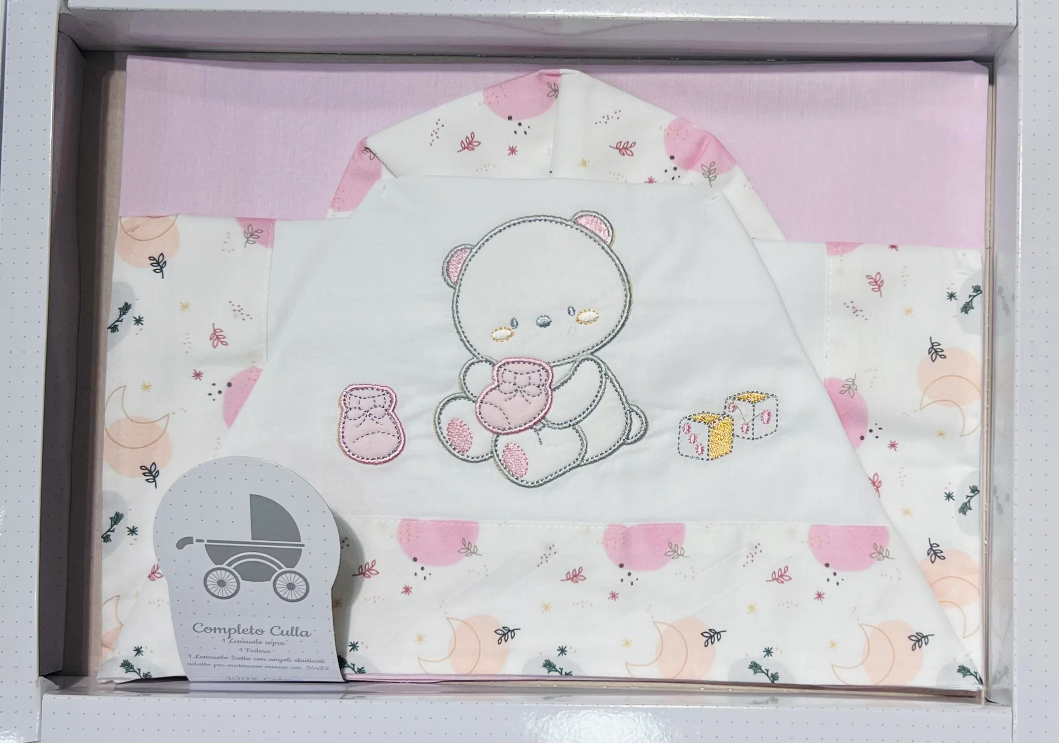 Realizzato in puro cotone di alta qualità, questo set è composto da tre pezzi: una federa, un lenzuolino sopra ricamato e un sotto con angoli.