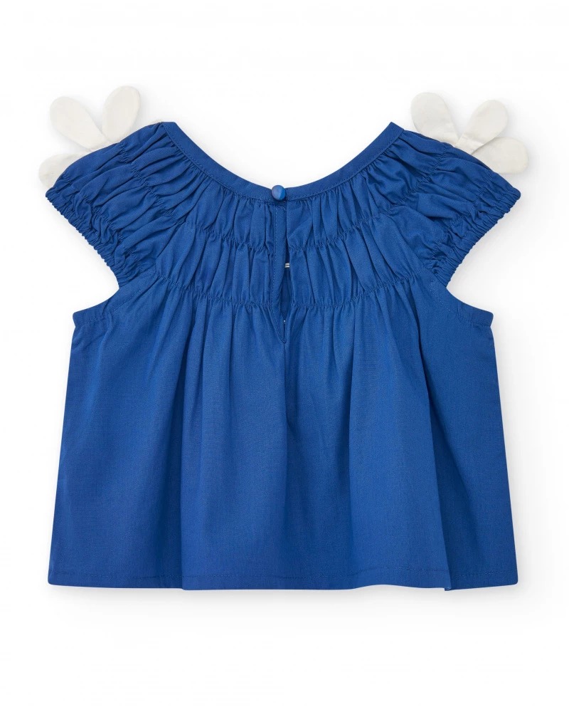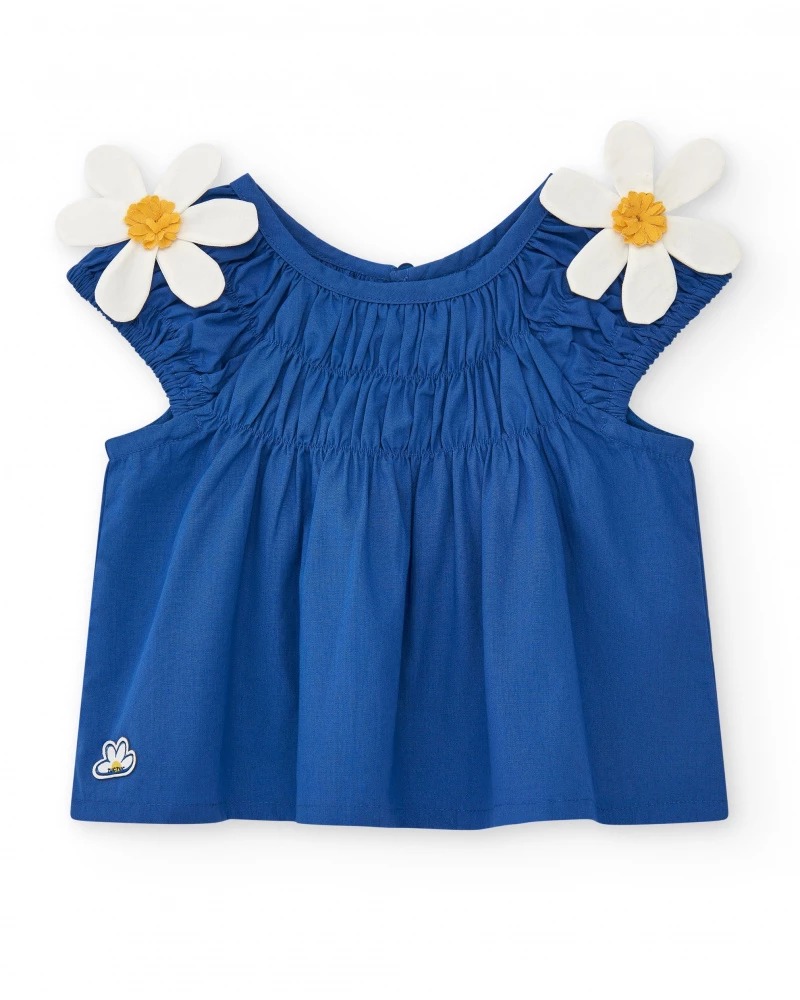 Camicia per bambina di colore blu con fiori decorativi sulle spalle e dettagli arricciati.