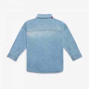 - Camicia unisex in denim a maniche lunghe in azzurro chiaro con effetto slavato e taschino applicato sul petto. Colletto classico e bottoni a pressione sul davanti per facilitare l’apertura.