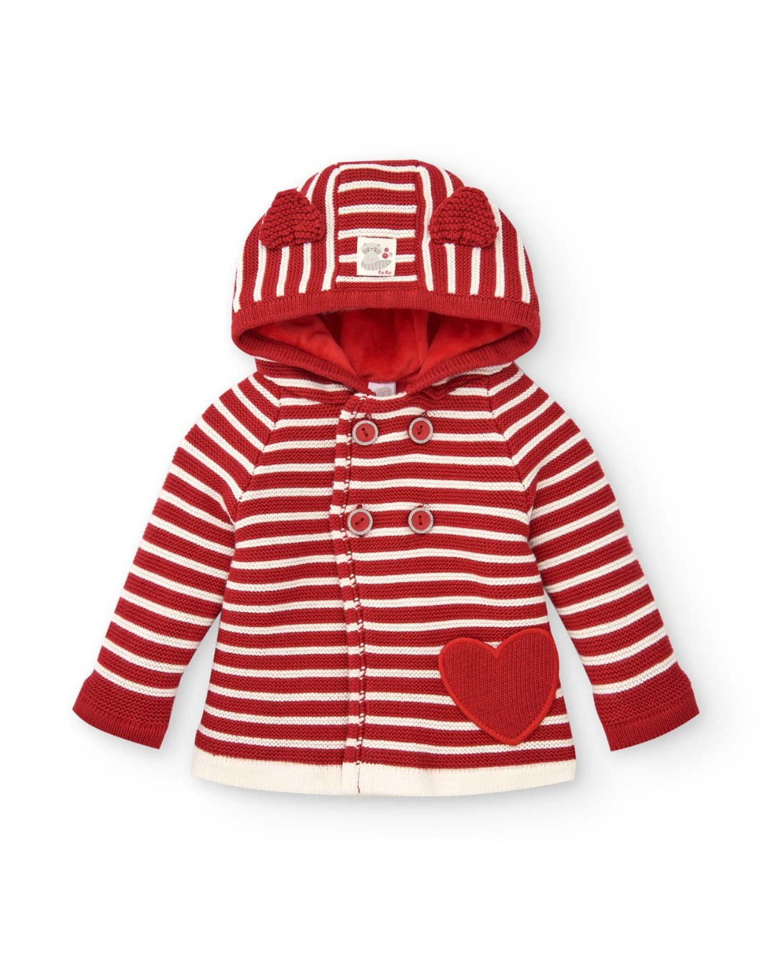 Giacca felpata per bambina a righe bianche e rosse con tasca a forma di cuore applicata sul lato.ย