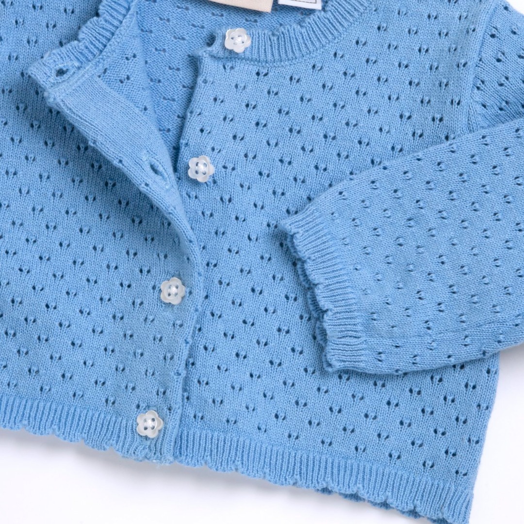Cardigan girocollo di colore celeste, lavorazione a maglia in tricot di cotone.