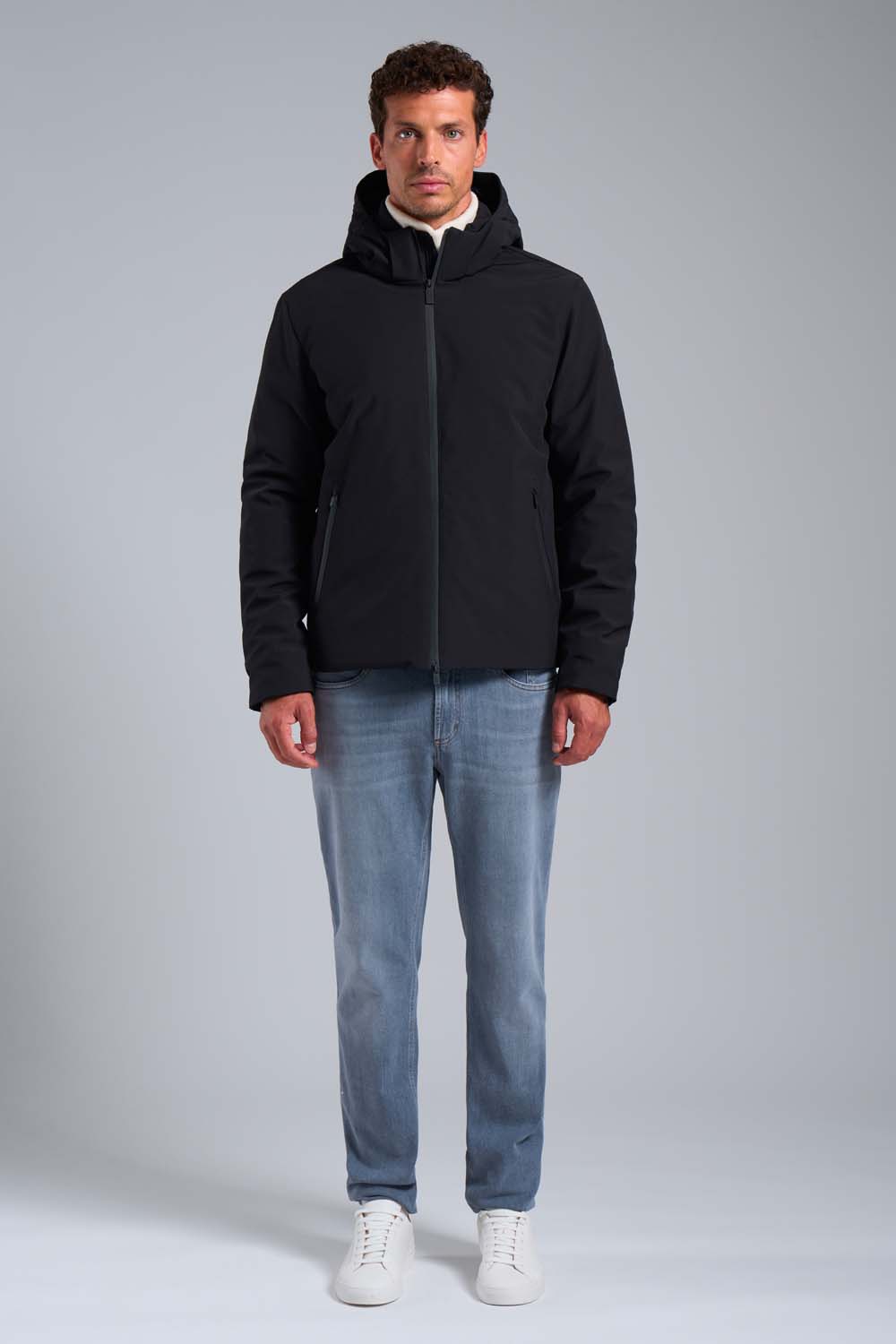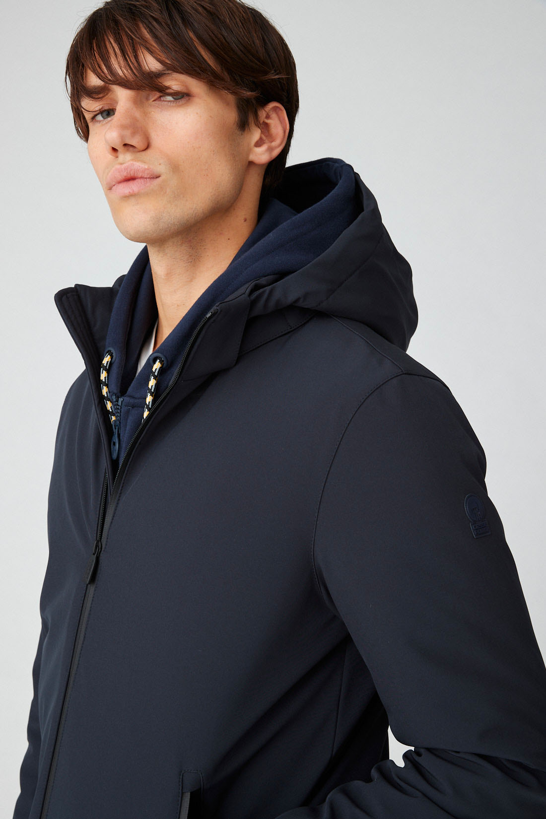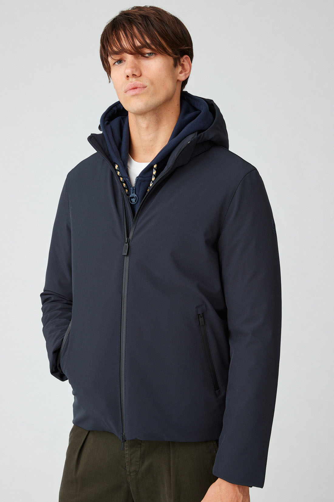 Giacca in softshell blu con cappuccio Giacca in softshell in colore nero da uomo realizzata con laminazione dry-tech ed imbottita in vera piuma 90/10. Lโimbottitura in vera piuma garantisce performance termiche, funzionalitร ed allo stesso tempo leggerezza. Il tessuto softshell รจ resistente allโacqua ed alle condizioni climatiche avverse, garantendo traspirabilitร ed impermeabilitร . DETTAGLI: -vestibilitร regular โ chiusura con zip waterproof black โ coulisse di regolazione al cappuccio e fondo โ puller logati neri โ tasca interna al petto โ logo rubber in tono sulla manica โ tessuto 10k 10k COMPOSIZIONE: โ Tessuto esterno: 94% Poliestere 6% Elastan โ Tessuto interno:…