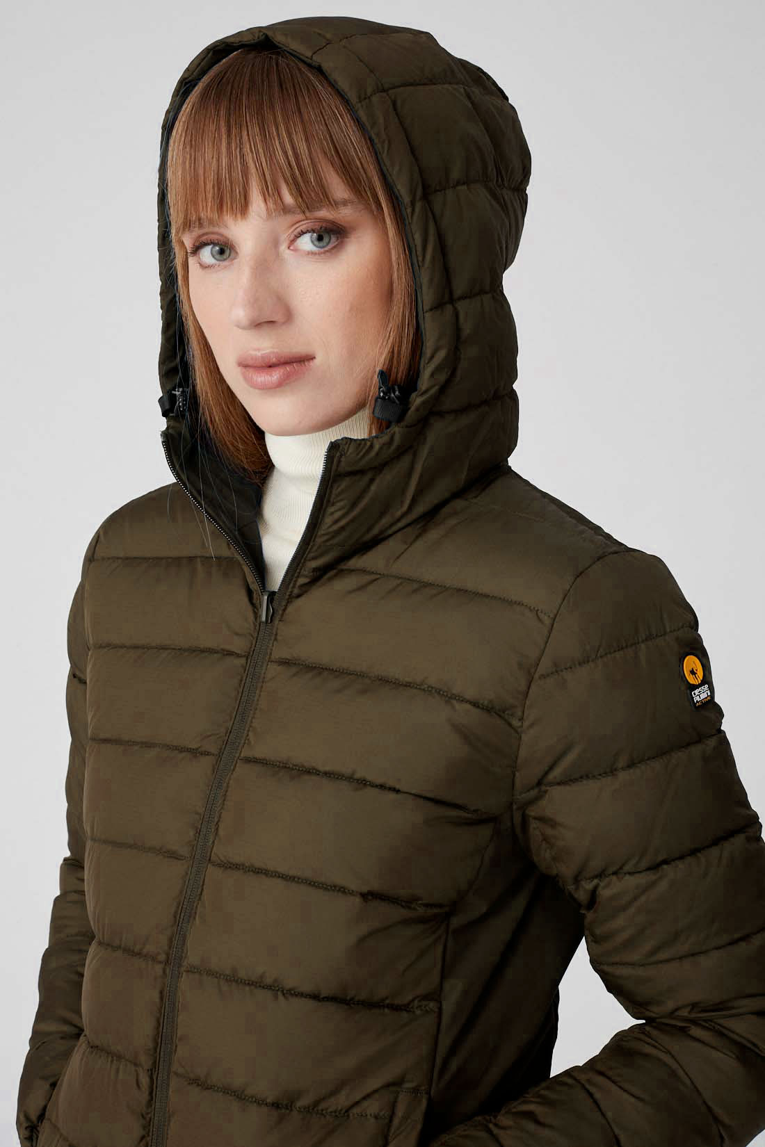 Piumino verde militare reversibile con cappuccio, realizzato in tessuto 4 way stretch riciclato doppio strato. Il capo รจ caratterizzato da zip reversibili in nylon e in tono e logo istituzionale Ciesse Piumini. Da un lato il piumino si presenta liscio, dallโaltro รจ caratterizzato da filze orizzontali, questa duplice anima contribuisce a valorizzare lโaspetto versatile, tecnico e dinamico del modello Jusy, che rispecchia unโidea sostenibile poichรจ tessuti, imbottitura e zip sono riciclati.