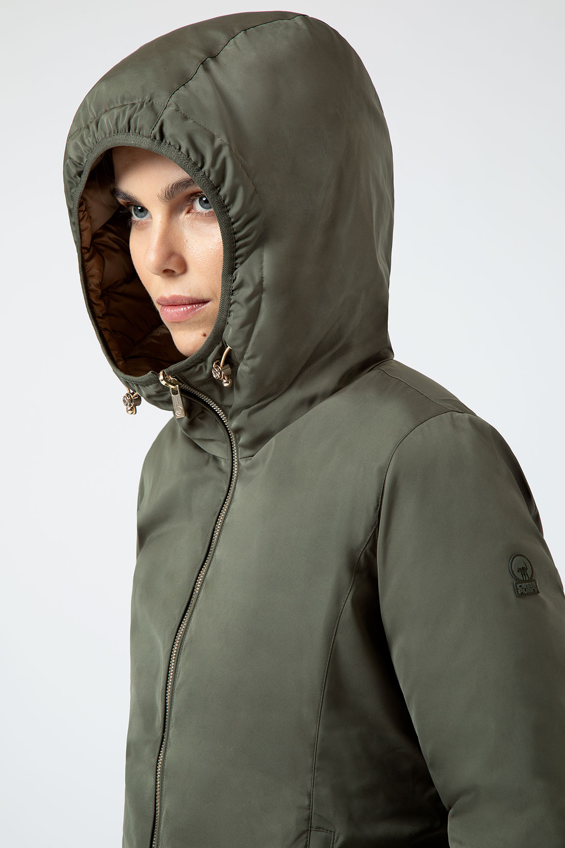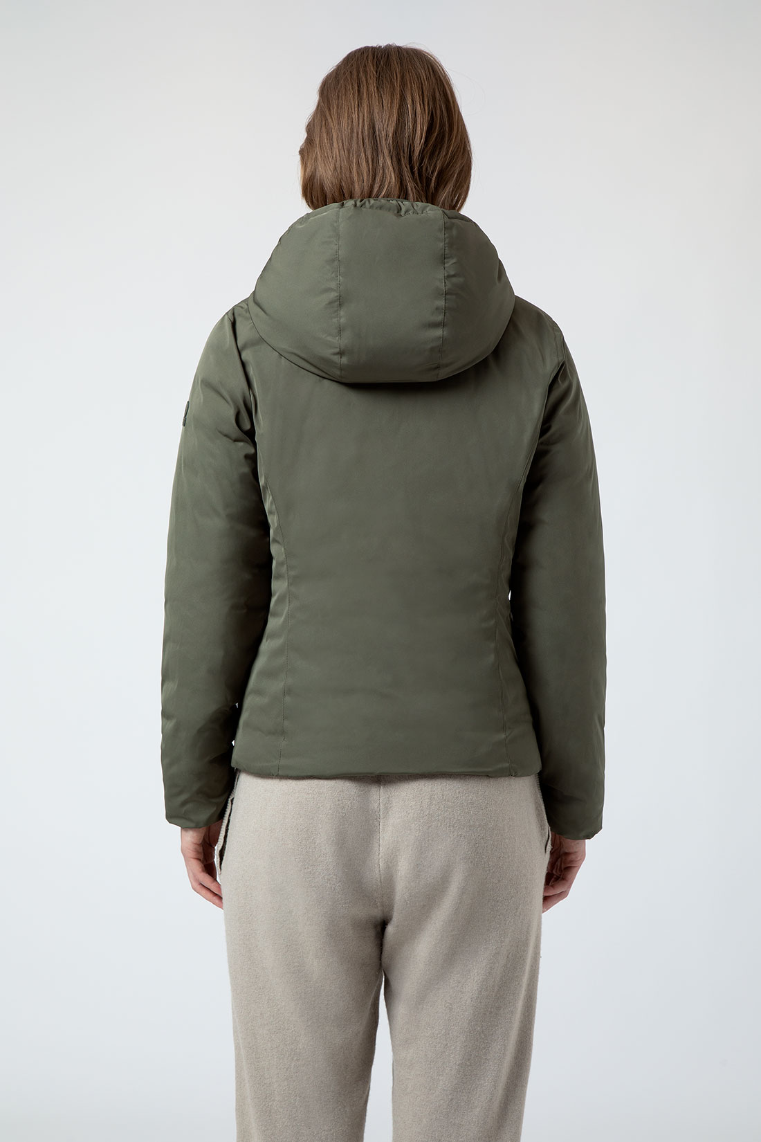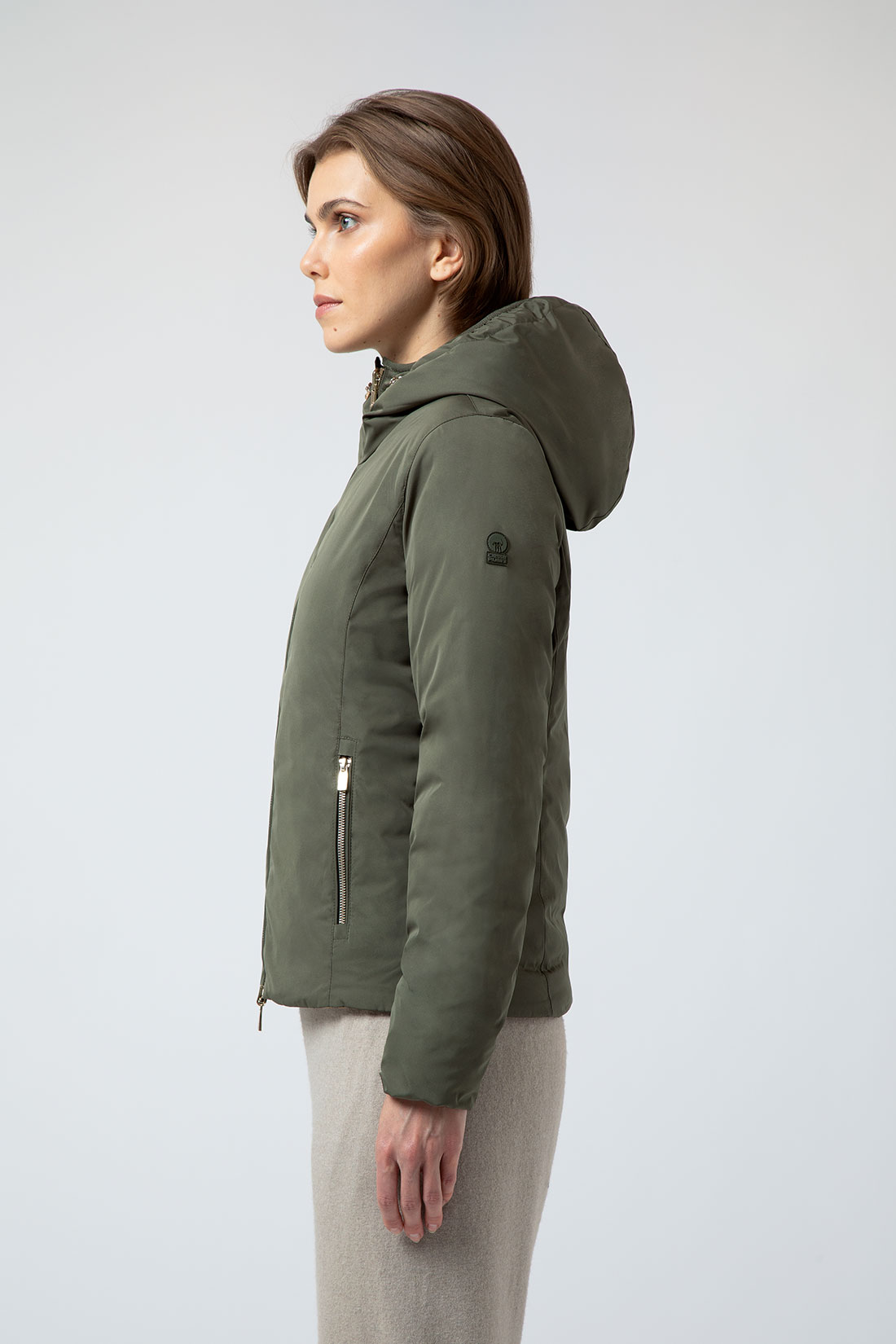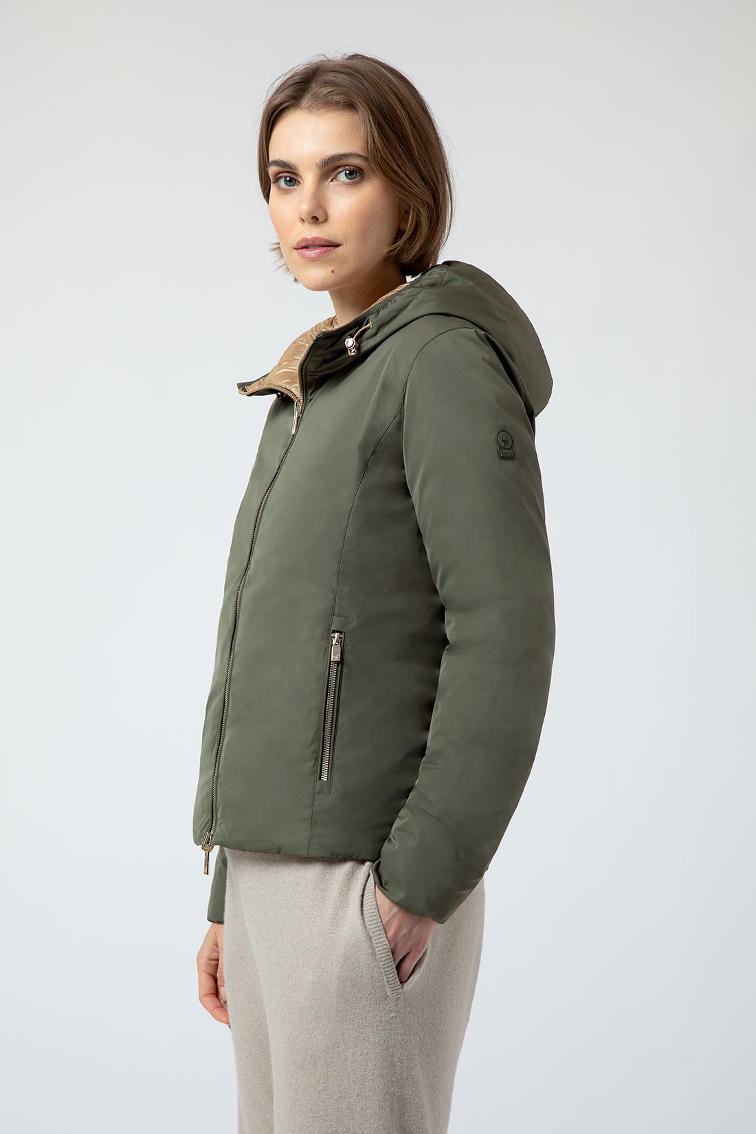 Piumino donna corto reversibile imbottito in vera piuma certificata 800 fill power