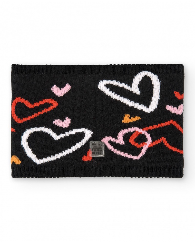 Scaldacollo per bambina in maglia fondo nero con ricami di cuoricini multicolore e bordi elasticizzati per una vestibilità confortevole.