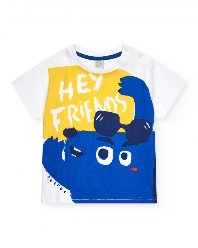 Completo per bambino composto da t-shirt bianca con stampa in tonalità blu e giallo, e bermuda blu con dettagli gialli.