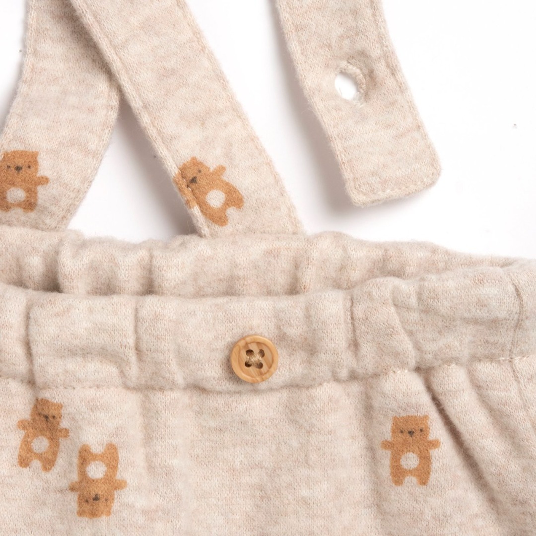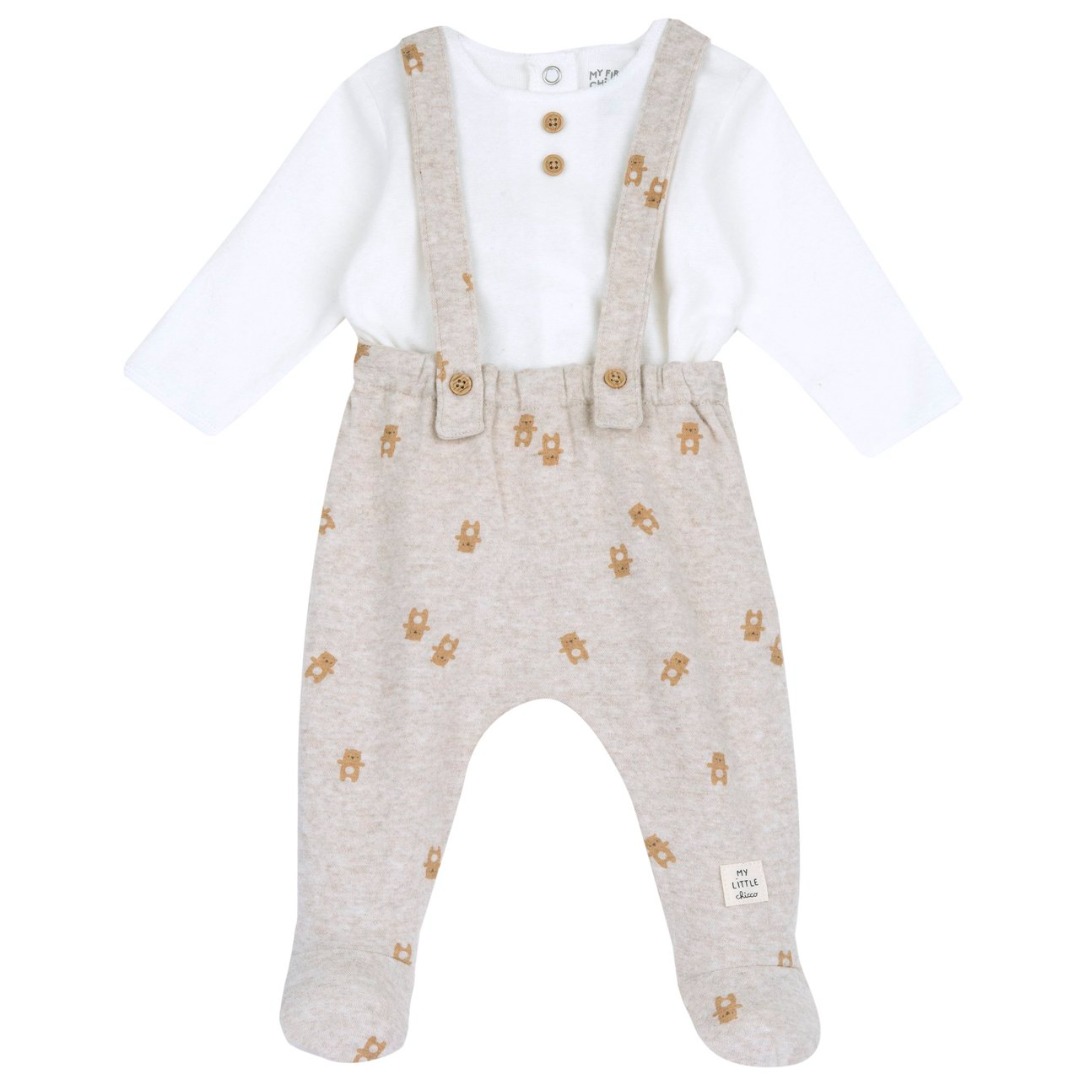Completo in interlock composto da maglia a manica lunga bianca con bottoncini effetto legno, e salopette con piedini beige con orsetti stampati.