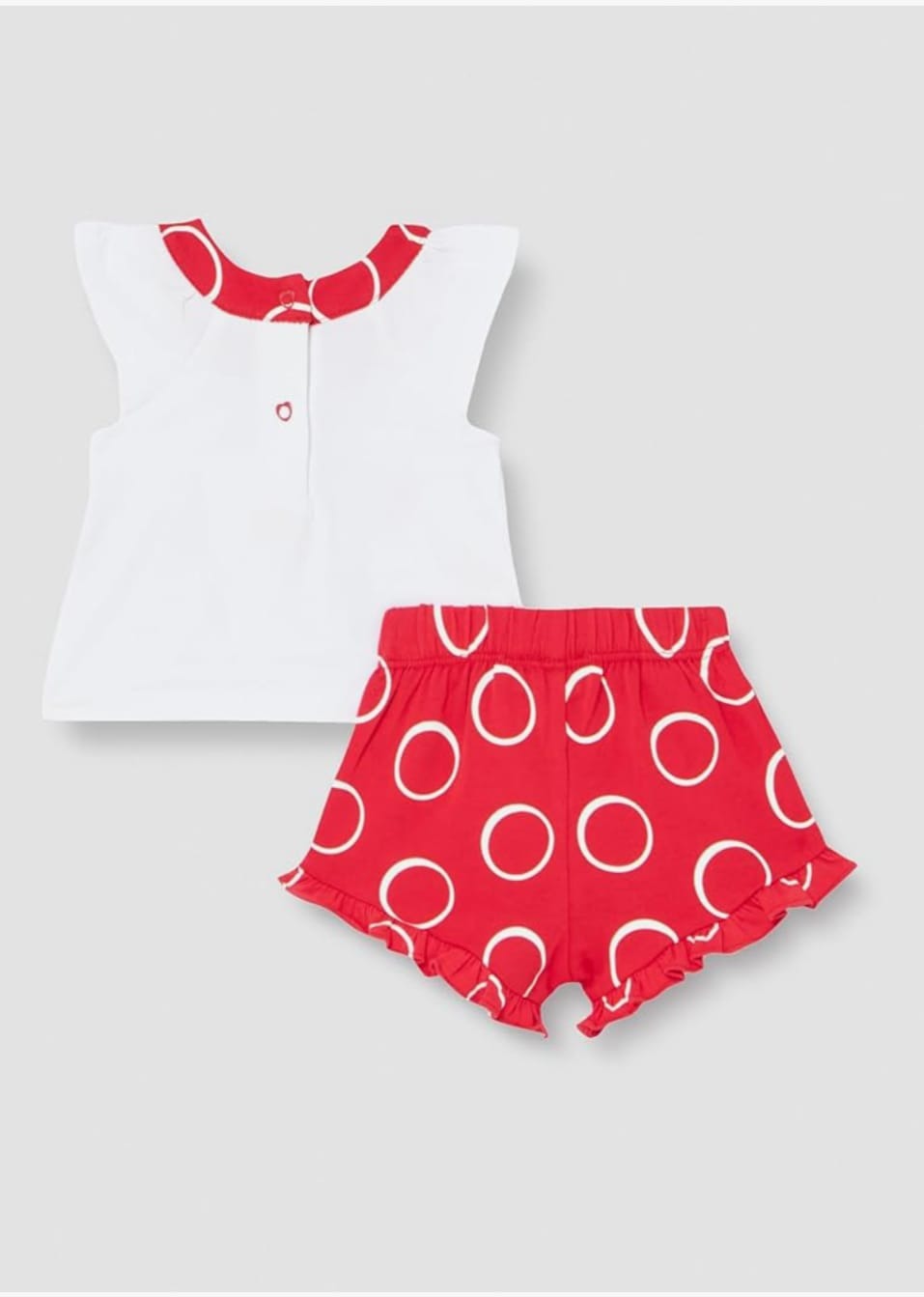 Completo maglietta girocollo e maniche ad aletta con pantaloni corti in jersey stampato. Maglietta bianca con stampa di coccinelle e bottoni automatici sul retro.