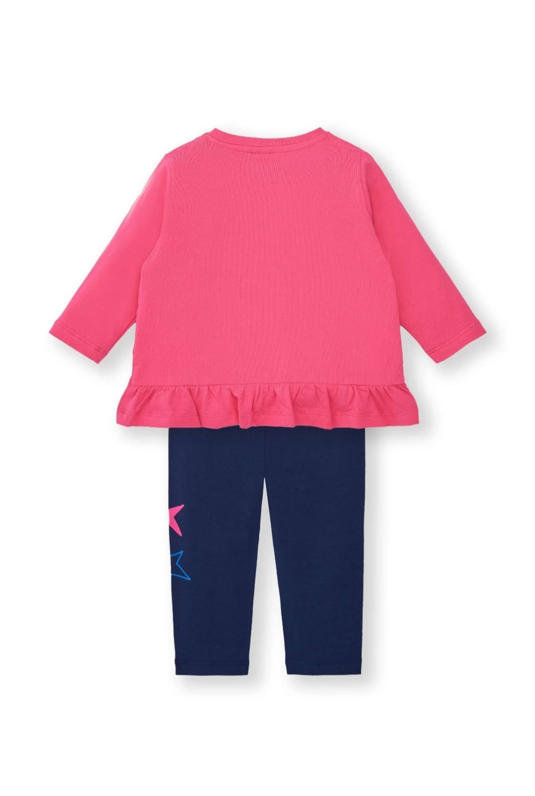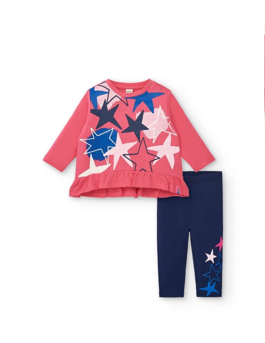 Completo per bambina composto da una maglietta a maniche lunghe fuxia con stelle stampate e leggings ciclisti blu con stampa di stelle sul lato.