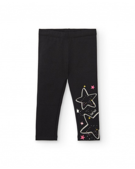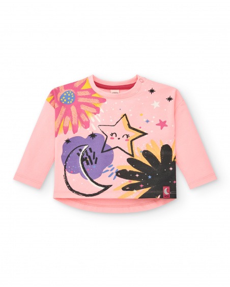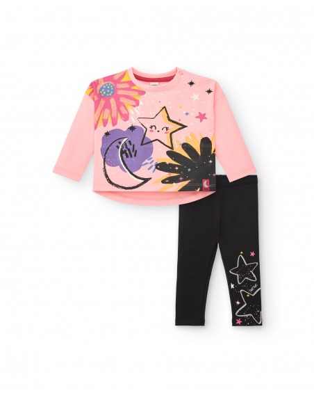 Completo per bambina composto da una maglietta a maniche lunghe rosa con stelle stampate e leggings ciclisti nero con stampa di stelle sul lato.