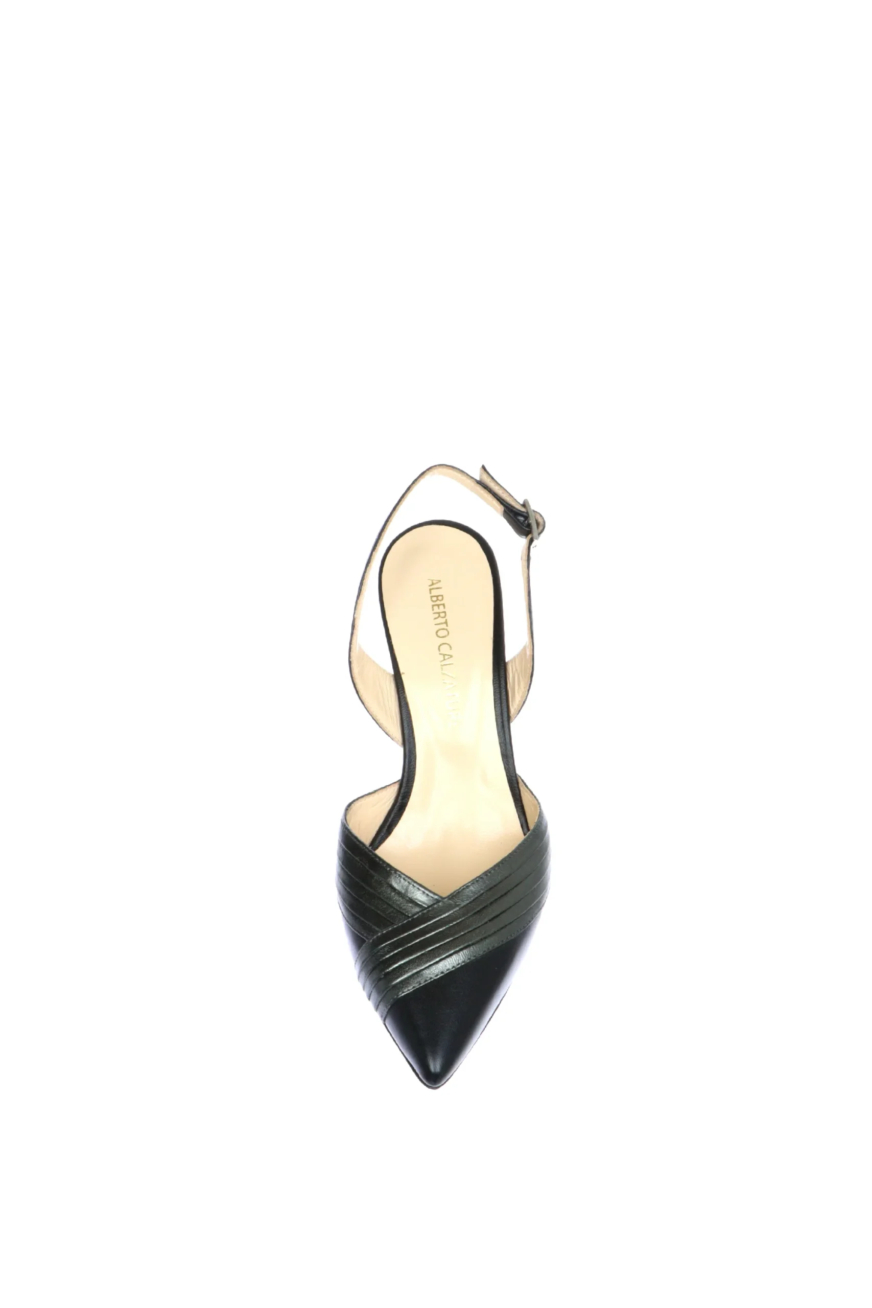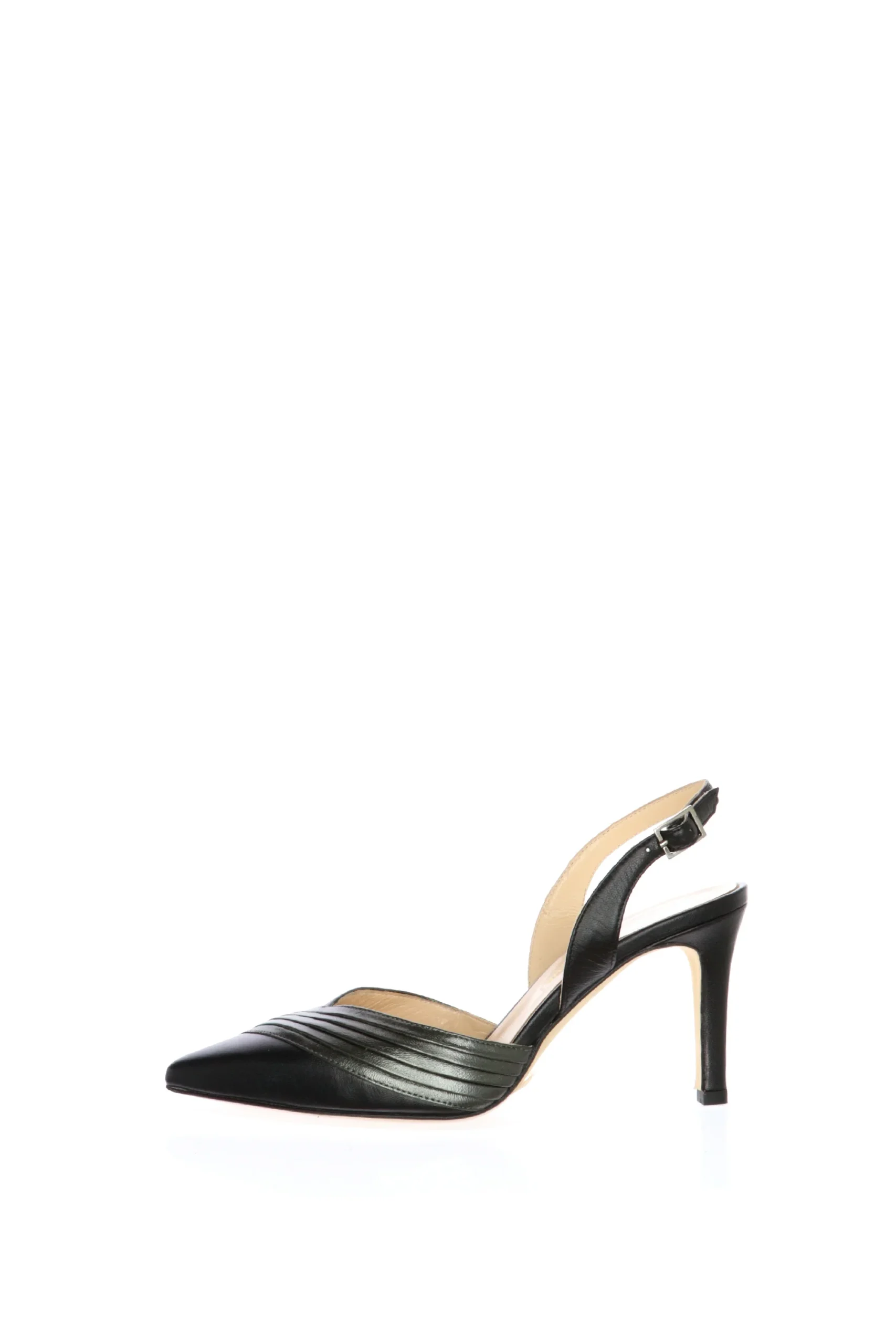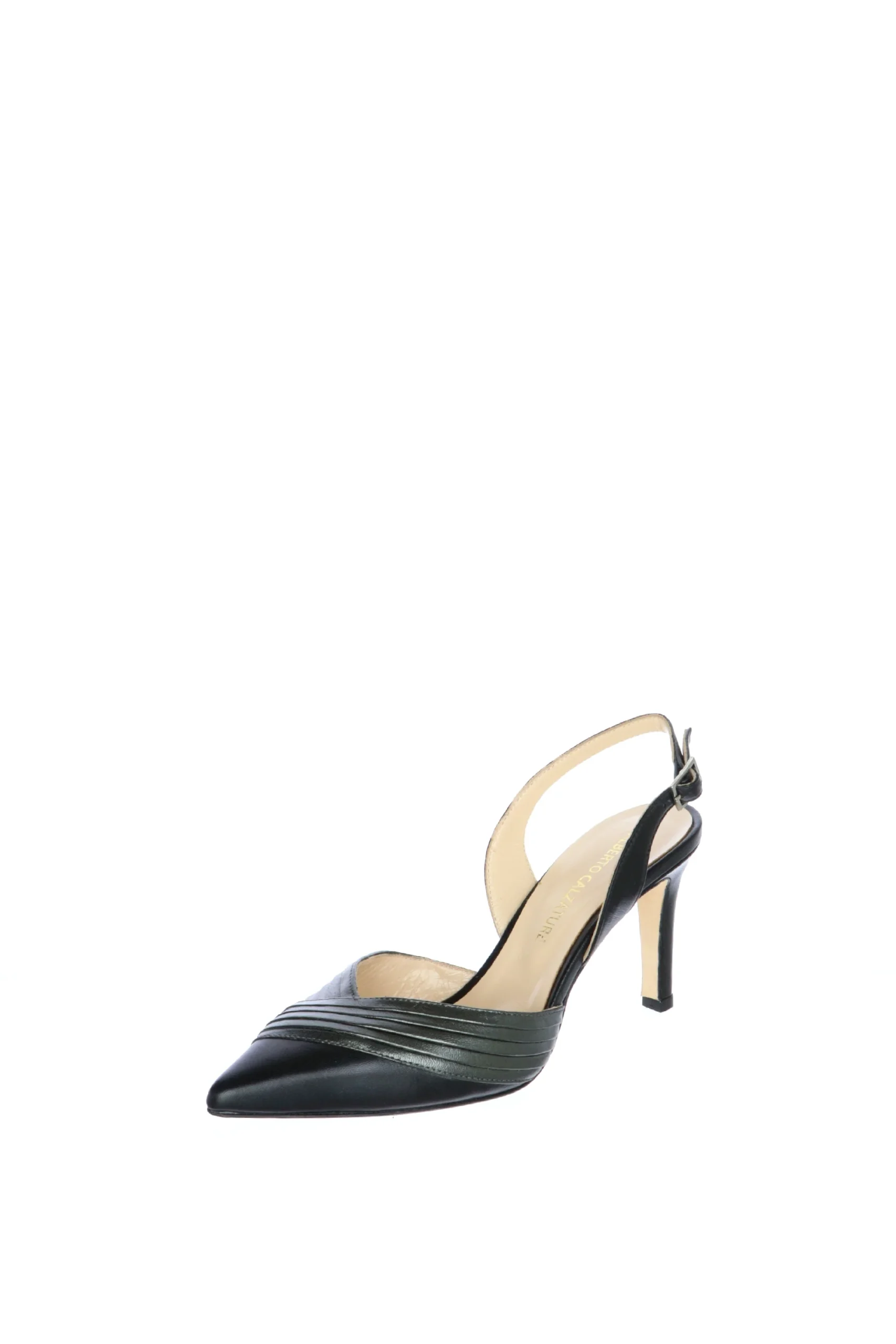 Decolletè aperto al tallone in pelle morbidissima, nero con dettagli antracite. Particolare scollo a V, slancia e abbraccia bene la pianta del piede. Una scarpa particolare e versatile, ideale per diverse occasioni d’uso. Prodotta interamente in vera pelle e in Italia. Qualità artigianale made in Italy!