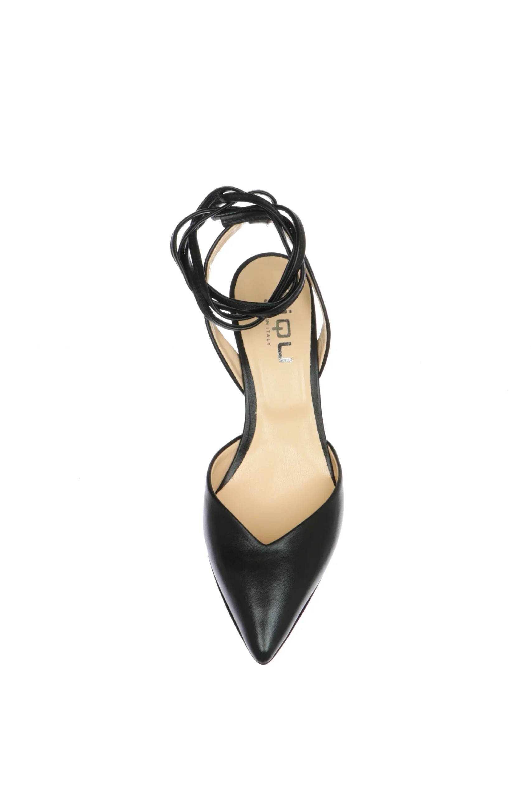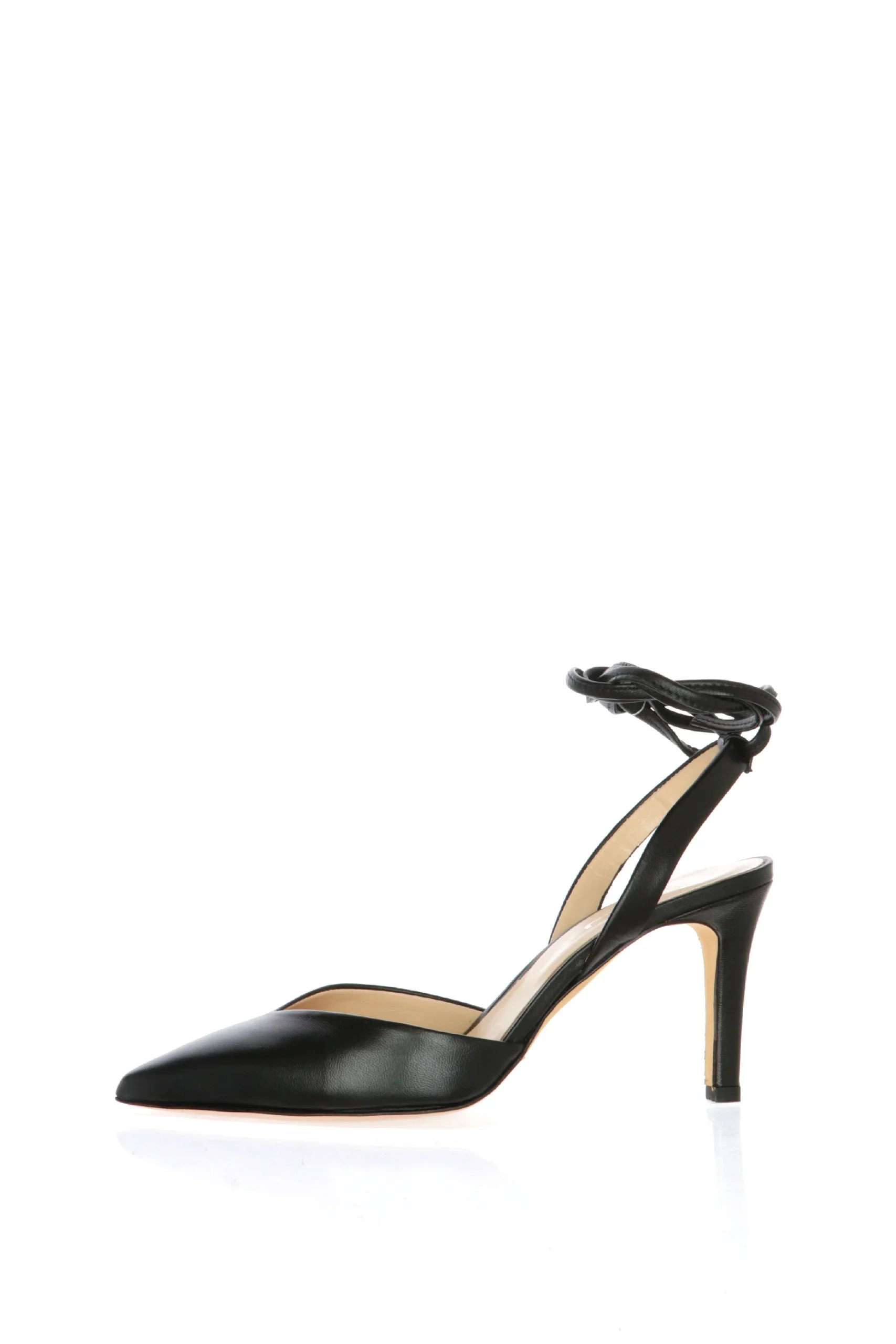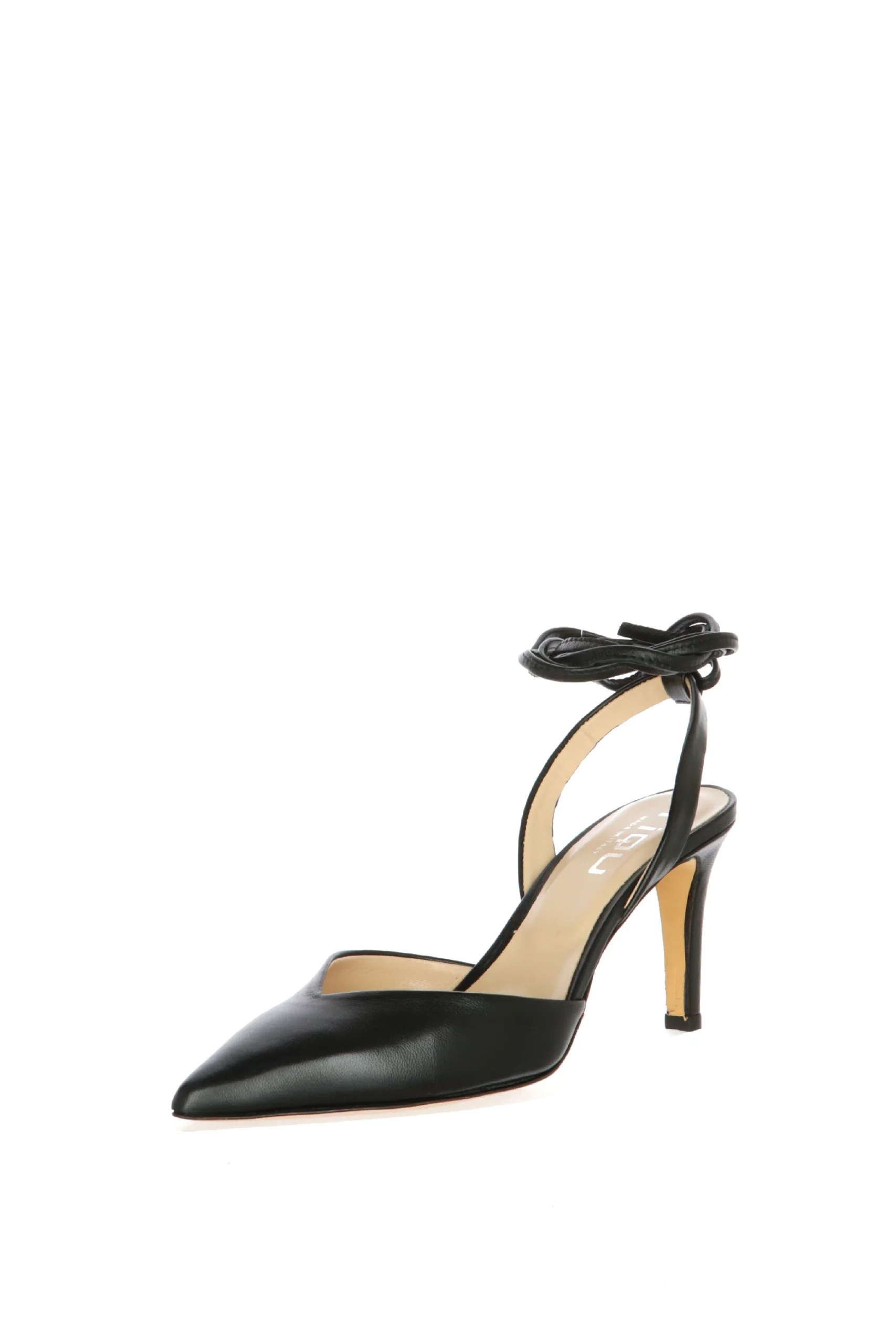 Decolletè in pelle aperto al tallone con laccio a caviglia nero o platino