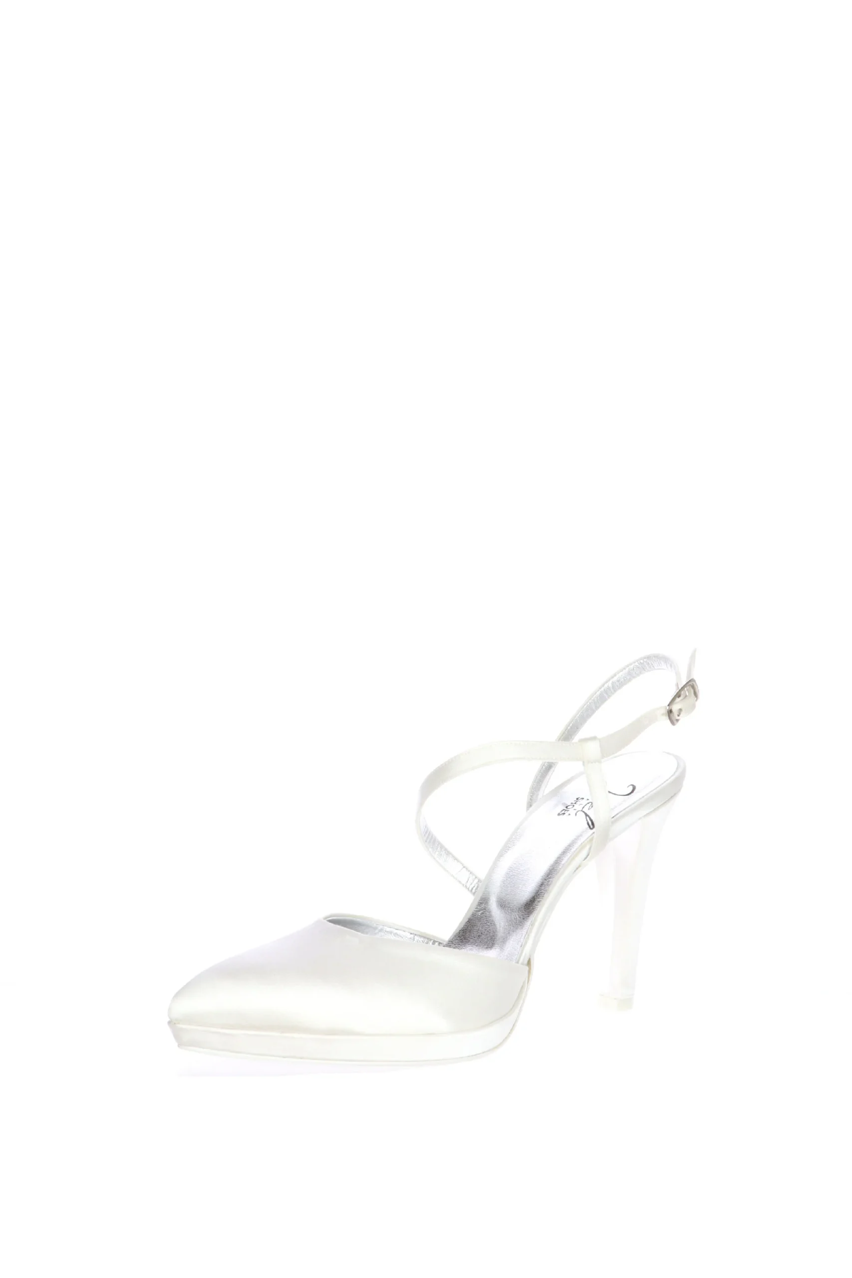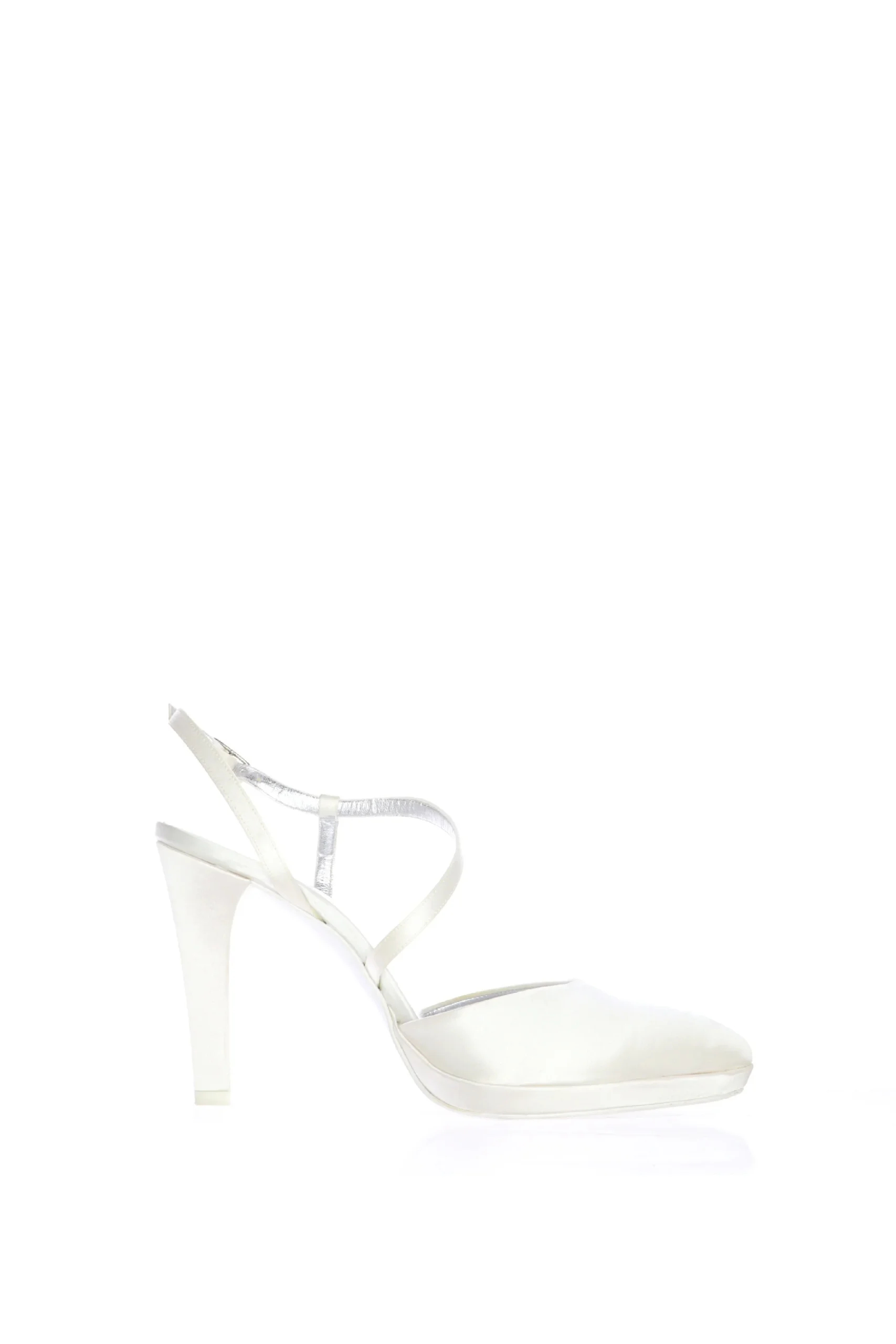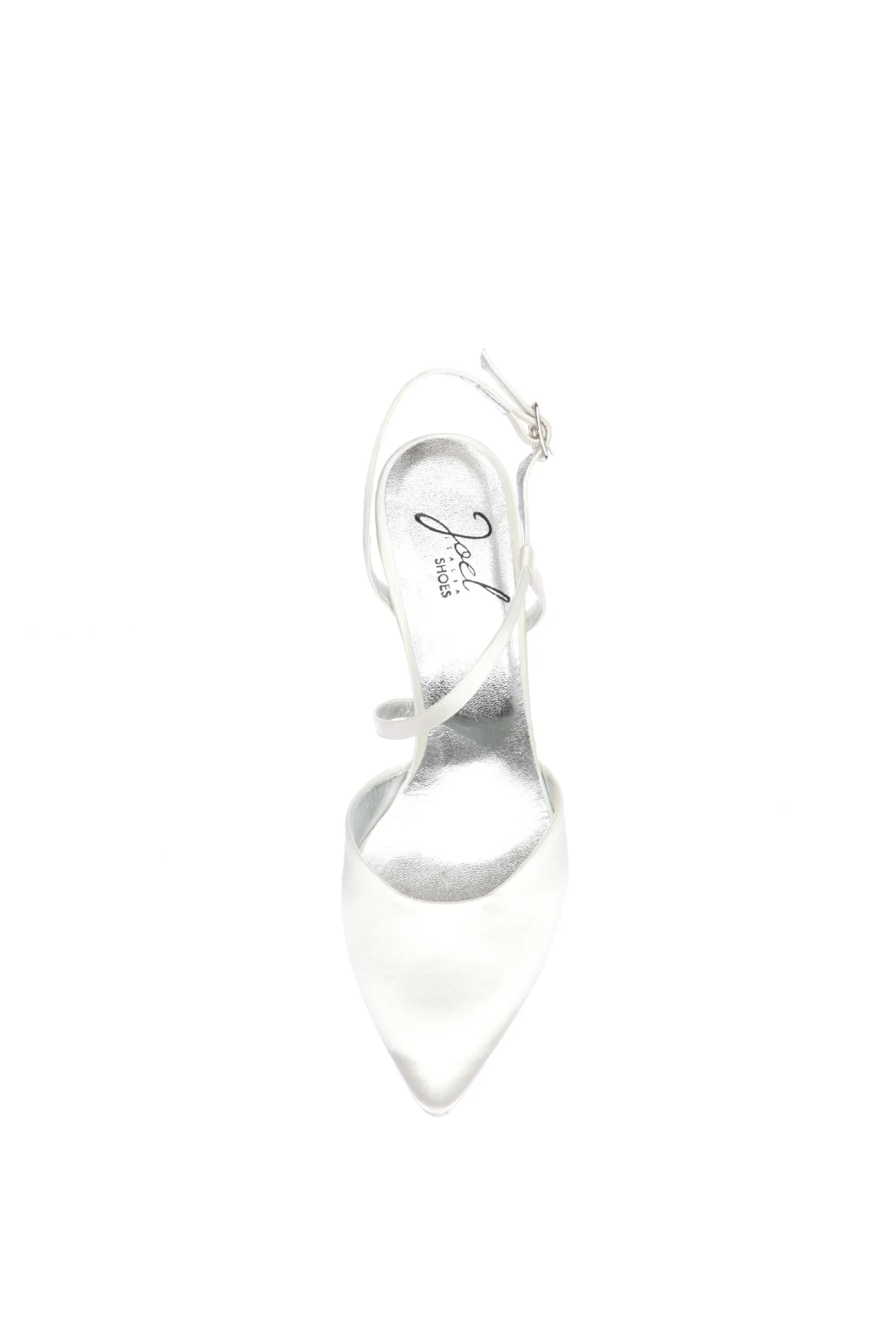 Decolletè sposa in raso bianco seta. Chiuso in punta e con tallone aperto e cinturino trasversale sul dorso del piede. Il davanti abbraccia bene tutta la pianta del piede, il cinturino trasversale mantiene fermo e sicuro il piede e slancia la figura. Rendi unico il tuo grande giorno Joel, gioielli da calzare! Qualità artigianale made in Italy