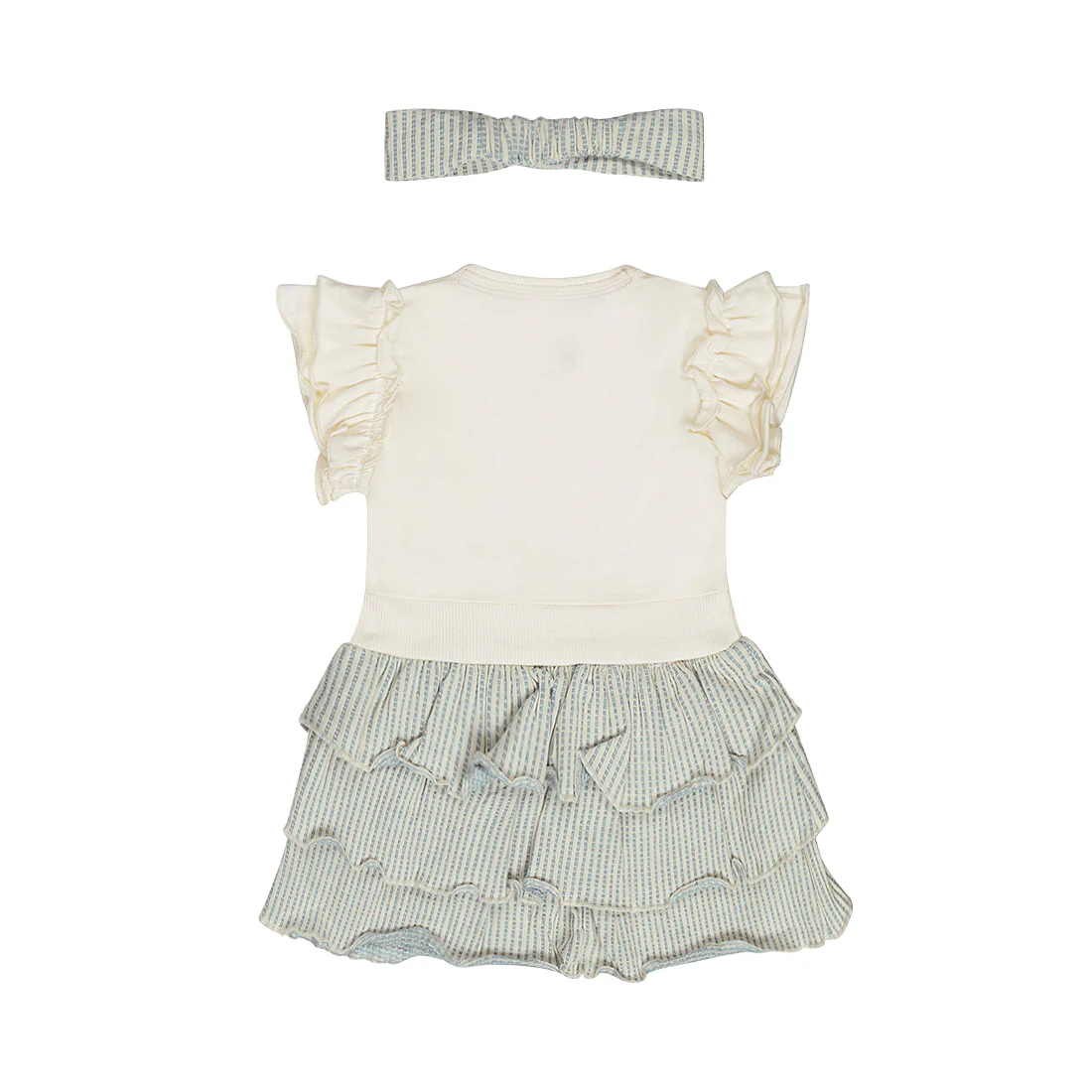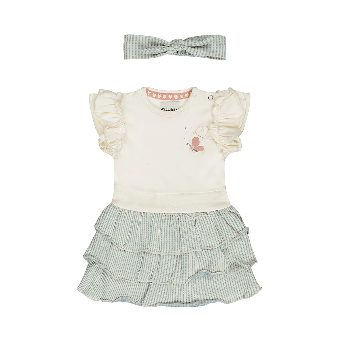 Adorabile abito neonata Dirkje con dettagli romantici e raffinati. Caratterizzato da balze delicate che donano movimento e eleganza, completato da una fascia in vita con fiocco coordinato. Perfetto per occasioni speciali o per coccolare il tuo piccolo con stile. Realizzato con attenzione ai dettagli, questo vestitino combina comfort e bellezza, ideale per le prime foto e i momenti più dolci della crescita.