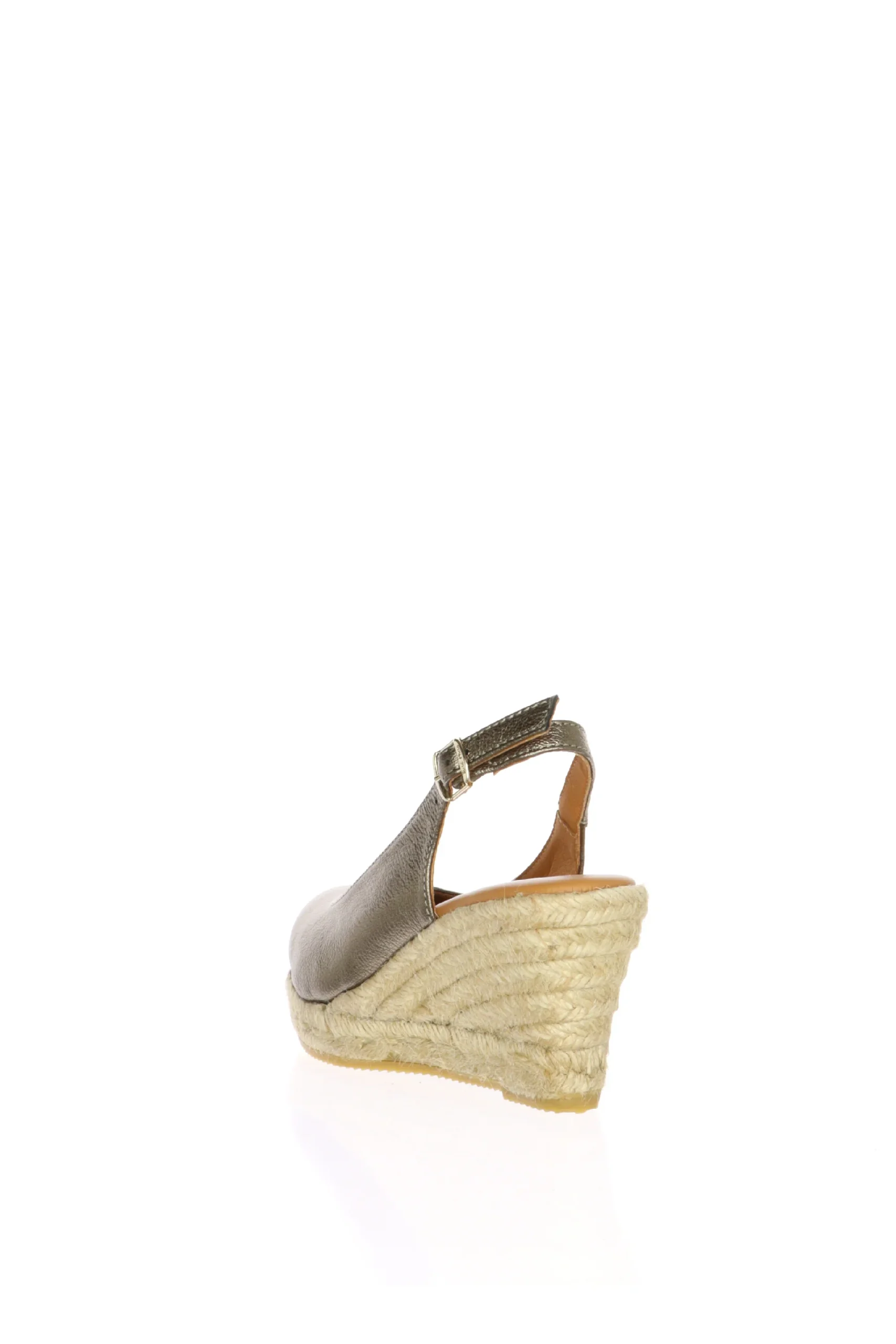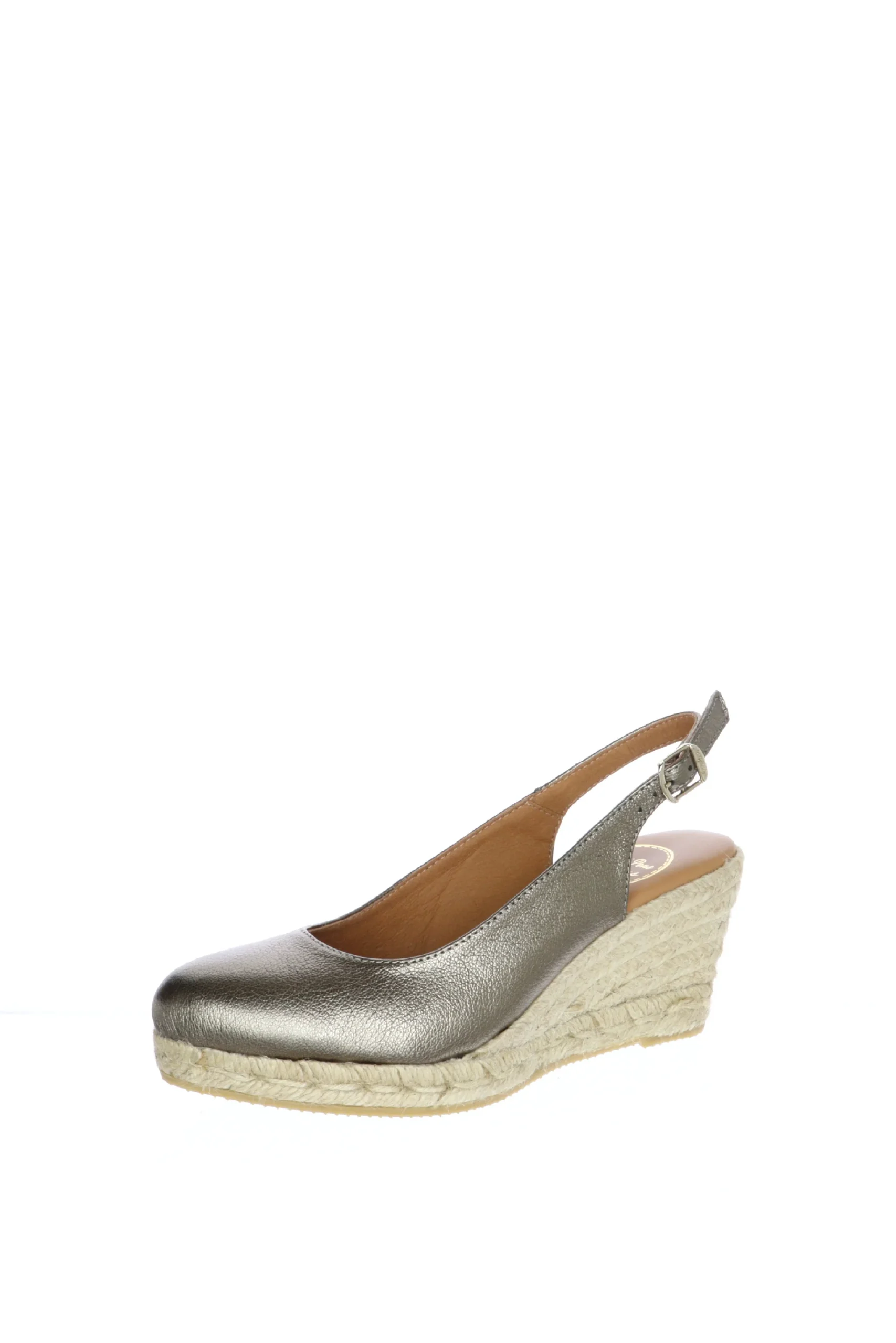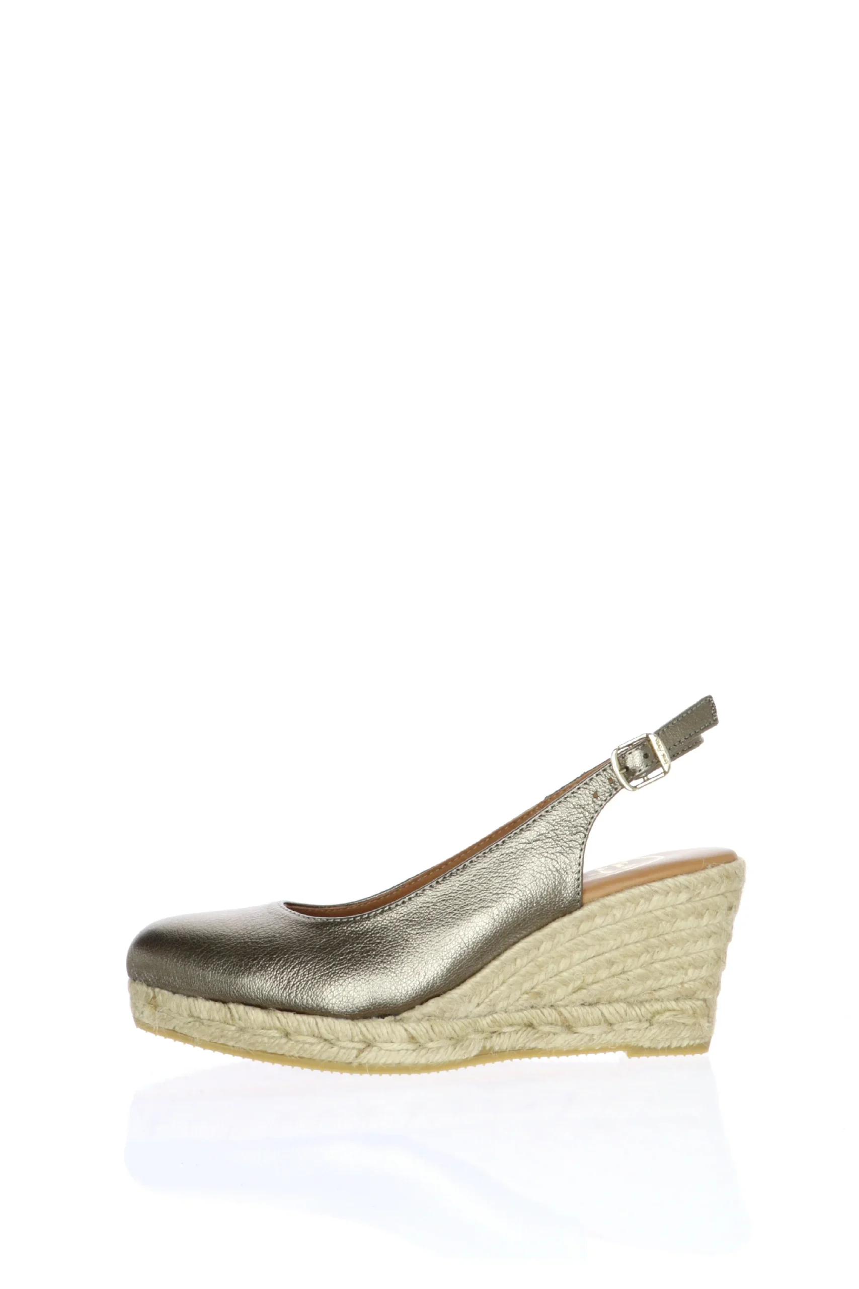 BREMEN รจ una espadrilla chiusa da donna con zeppa in pelle laminata a tinta unita, bronzo. La zeppa in juta ha unโaltezza totale di 6 cm. La suola รจ in gomma antiscivolo. La soletta interna in imbottita รจ foderata in tessuto di cotone che le conferiscono una grande comoditร , La fascia posteriore ha un elastico interno per regolarla meglio al piede. Lโunione della pelle scamosciata e della suola รจ cucita a mano con un filo di cotone. Per tutti i giorni ed il tempo libero, ideale per la primavera e l’estate, da abbinare con tanti outfit! Toni Pons, espadrillas originali fatte a mano in Spagna. Disponibile fino al n 42