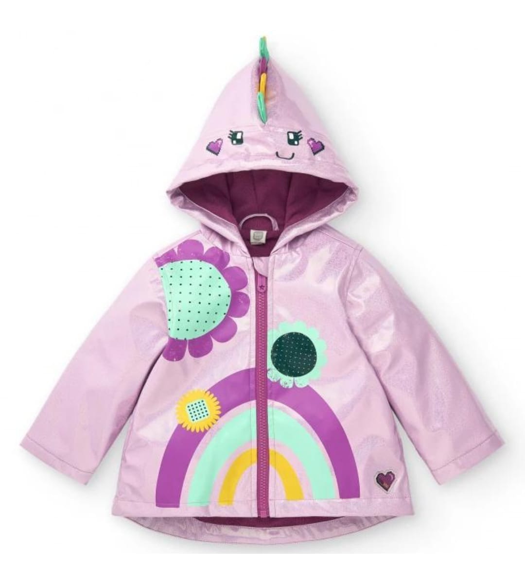 Giacca impermeabile per bambina in lilla chiaro glitterato con stampa di un arcobaleno e fiori colorati.