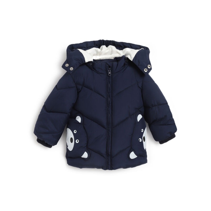 Giubbotto in tessuto tecnico blu, tasche con applicazioni a forma di orso ed elastico inserito ai bordi dei polsi.