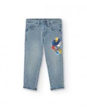 Pantaloni lunghi in denim chiaro elasticizzato, con stampa colorata sul davanti. Apertura con zip e bottone automatico, vita con elastico regolabile.