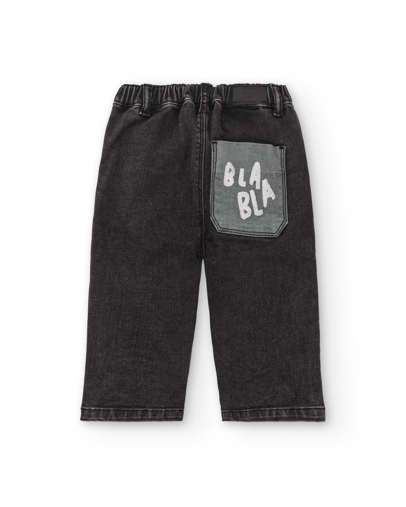Pantaloni lunghi in denim elasticizzato di colore nero, con tasca posteriore applicata e stampa bianca "bla bla". Apertura con zip e bottone automatico, vita con elastico regolabile.