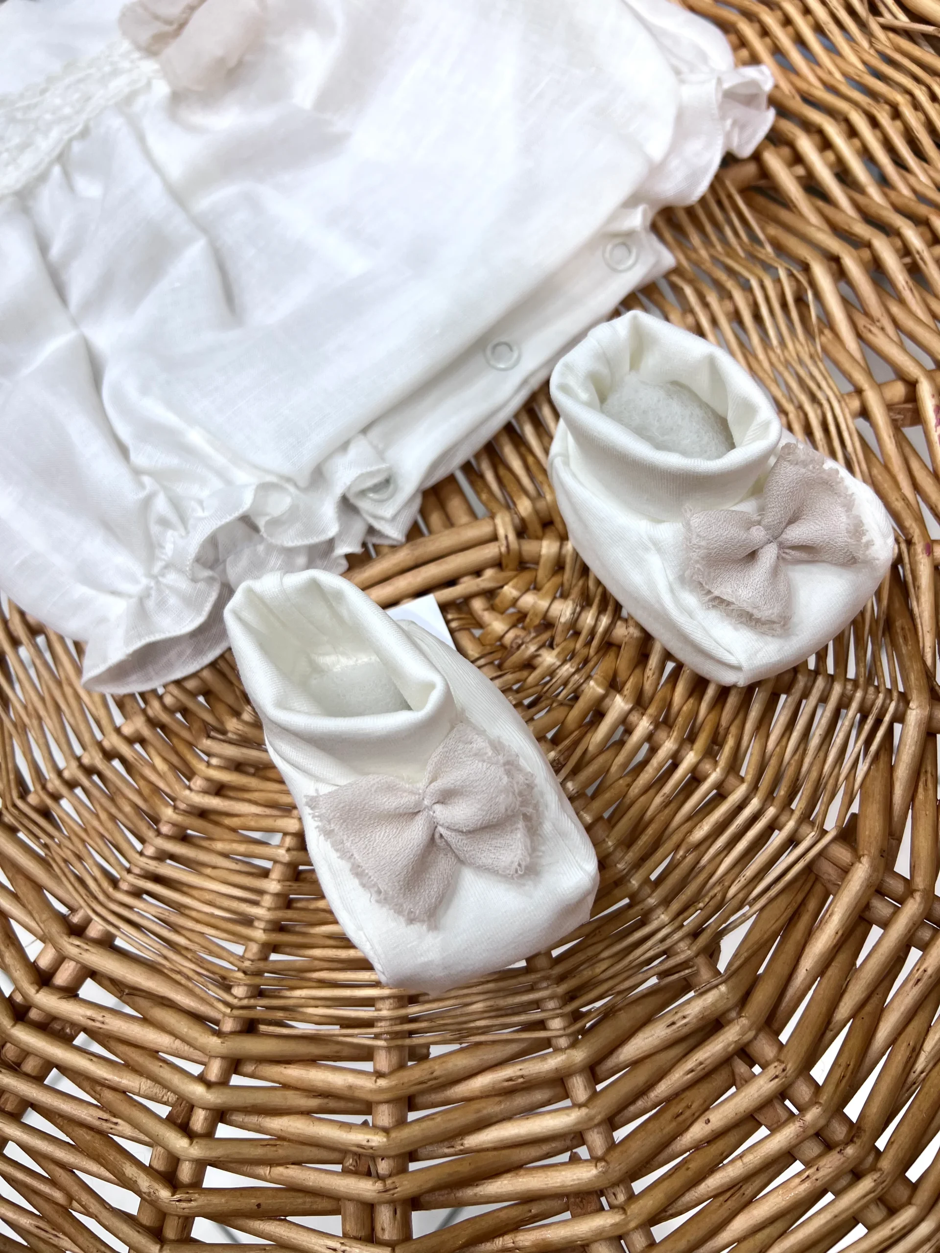 Scarpine realizzate in cotone bielastico, materiale che garantisce elasticità e comfort per i piedi delicati del neonato. Il design elegante è completato da un delicato fiocco decorativo che aggiunge un tocco di raffinatezza. La struttura morbida e flessibile favorisce il naturale sviluppo del piede, mentre la composizione in cotone puro assicura traspirazione e igiene. Ideali per i primi mesi di vita, queste scarpine combinano praticità e stile, perfette sia per l’uso quotidiano che per occasioni speciali.