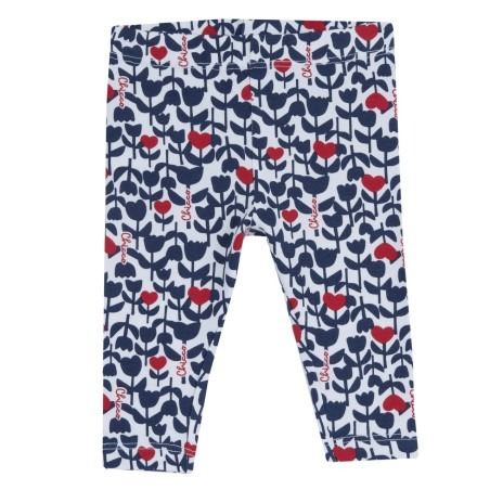 Leggings in jersey di cotone per bambina, fantasia fiori a forma di cuore blu e rosso. Pratico e comodo da indossare grazie alla vita elastica.