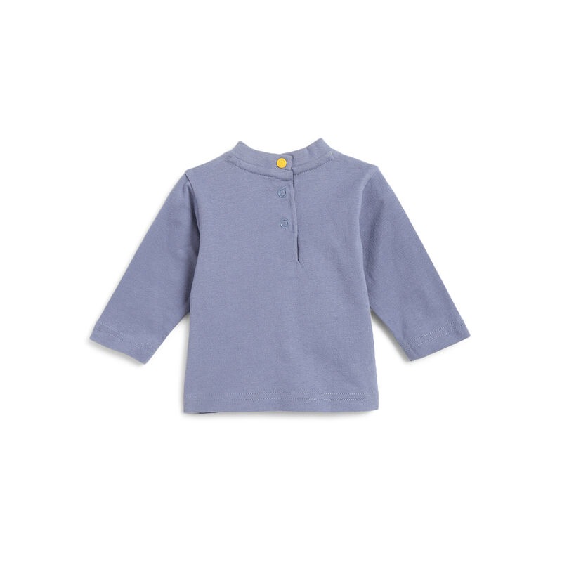 Maglietta manica lunga in jersey di colore celeste con stampa di animaletti sportivi sul davanti nei toni del giallo. Apertura dietro con bottoni automatici.