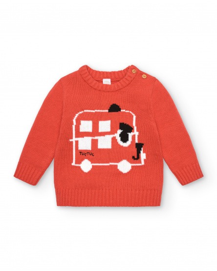 Maglione in tricot per bambino di colore rosso con ricamato di uno scuolabus sul petto. Ha bottoni effetto legno con asola sulla spalla per facilitare il cambio.