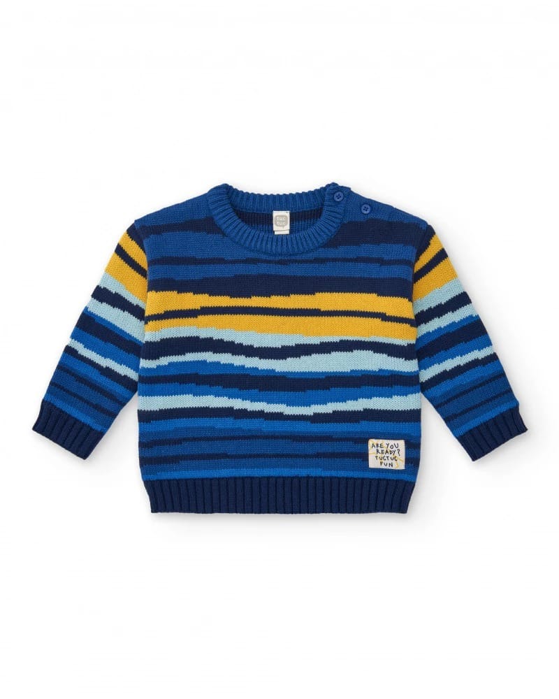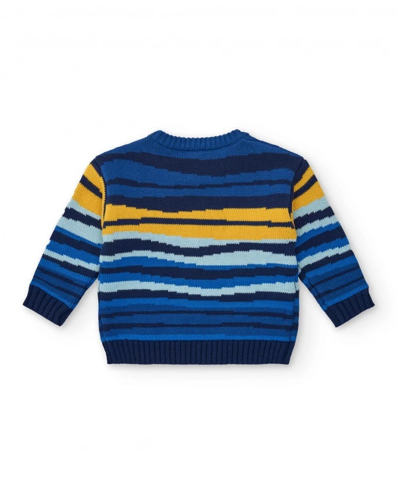 Maglione in maglia per bambino di colore blu navy, decorato con righe orizzontali nei toni del giallo, blu e turchese che donano uno stile allegro e vivace.