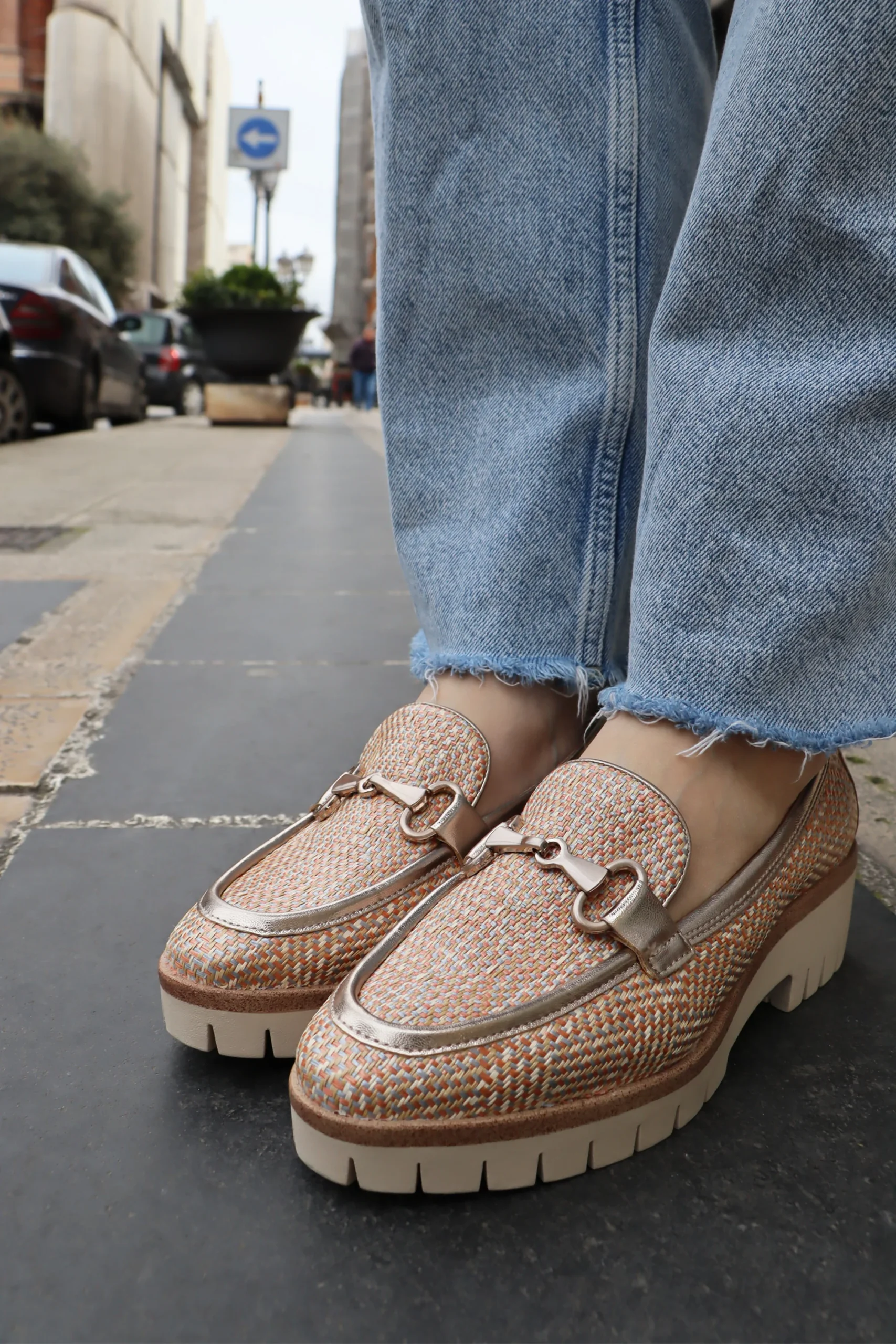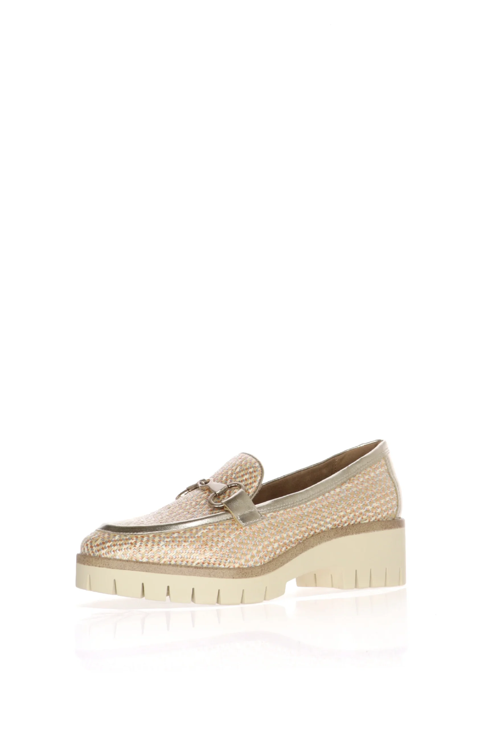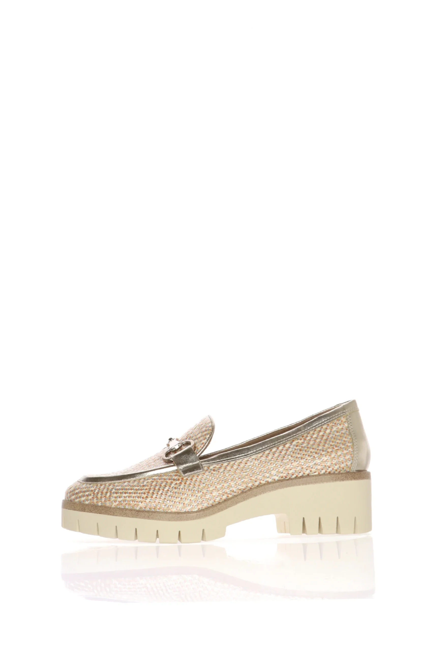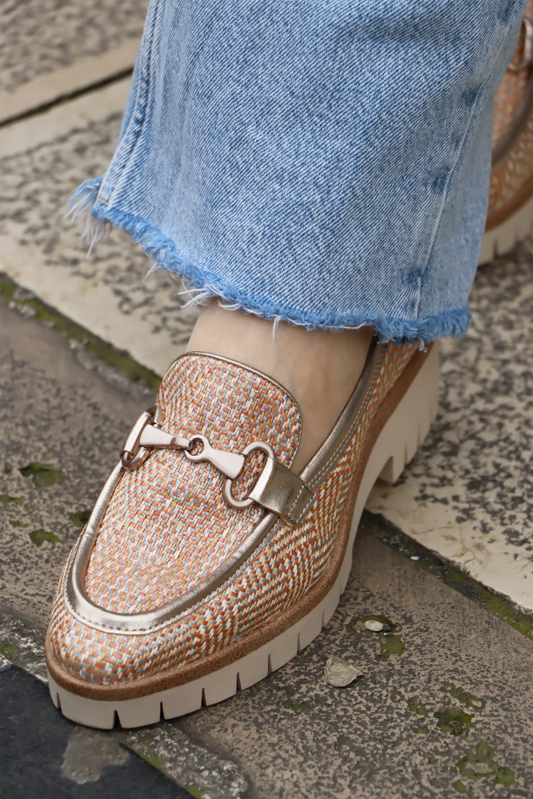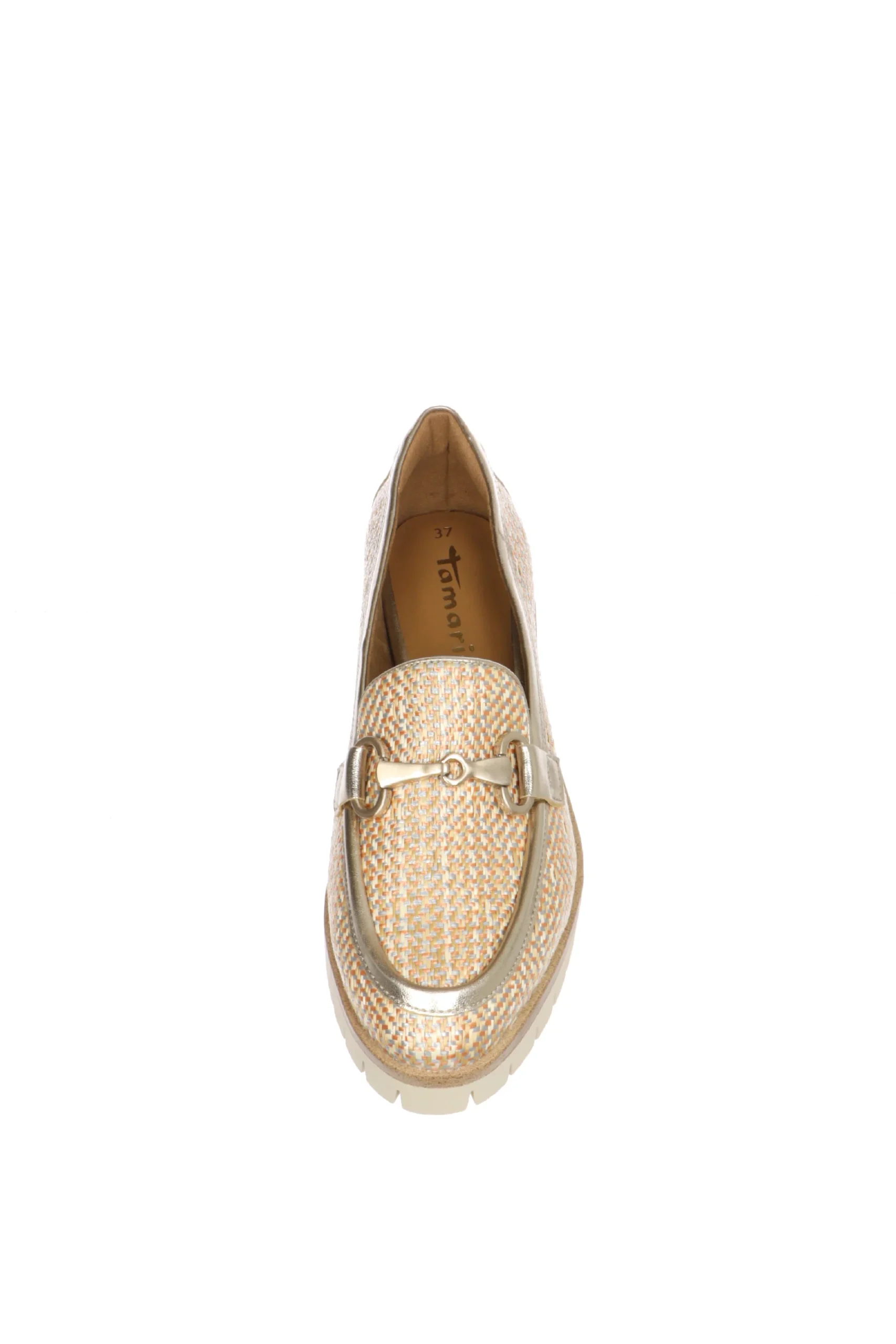 Tamaris da donna, un capolavoro di stile e comfort. La tomaia intrecciata in tessuto multicolore e i dettagli in pelle metallizzata dorata conferiscono un tocco di eleganza contemporanea. La fibbia decorativa dorata aggiunge un elemento di lusso, mentre la suola in gomma beige con tacco alto e scanalature profonde garantisce stabilitร e comfort per tutto il giorno. Perfetto per un look casual chic, questo mocassino combina praticitร e stile, rendendolo ideale per ogni occasione. Disponibile ora nel nostro ecommerce, non lasciarti sfuggire questo must-have per il tuo guardaroba.