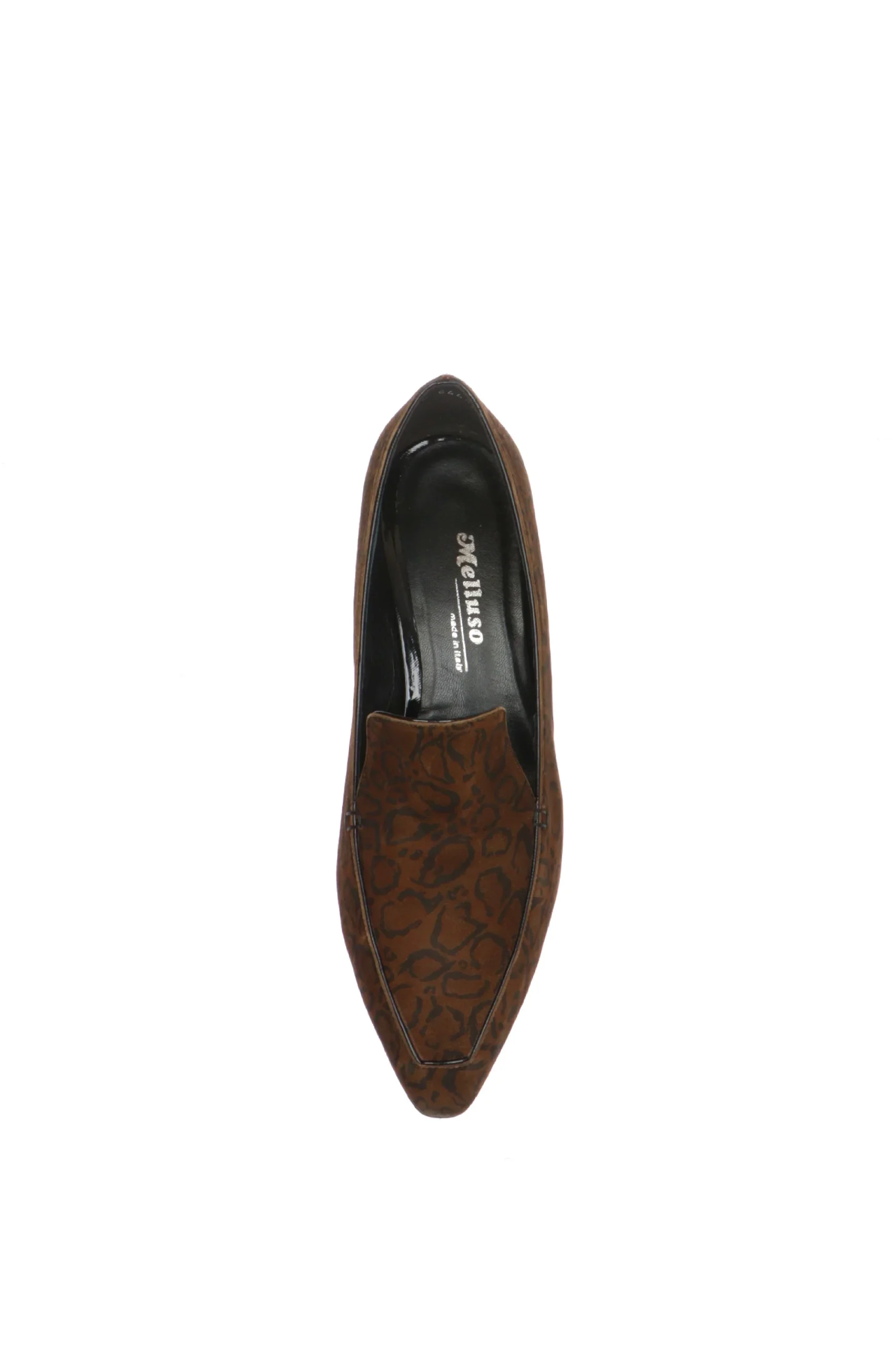 Mocassino cioccolato con stampa leopardo, in morbido camoscio al tatto rasato. Tendenza e confort, in una scarpa con carattere! Rendi unici i tuoi outfit! Melluso, qualitร artigianale made in Italy