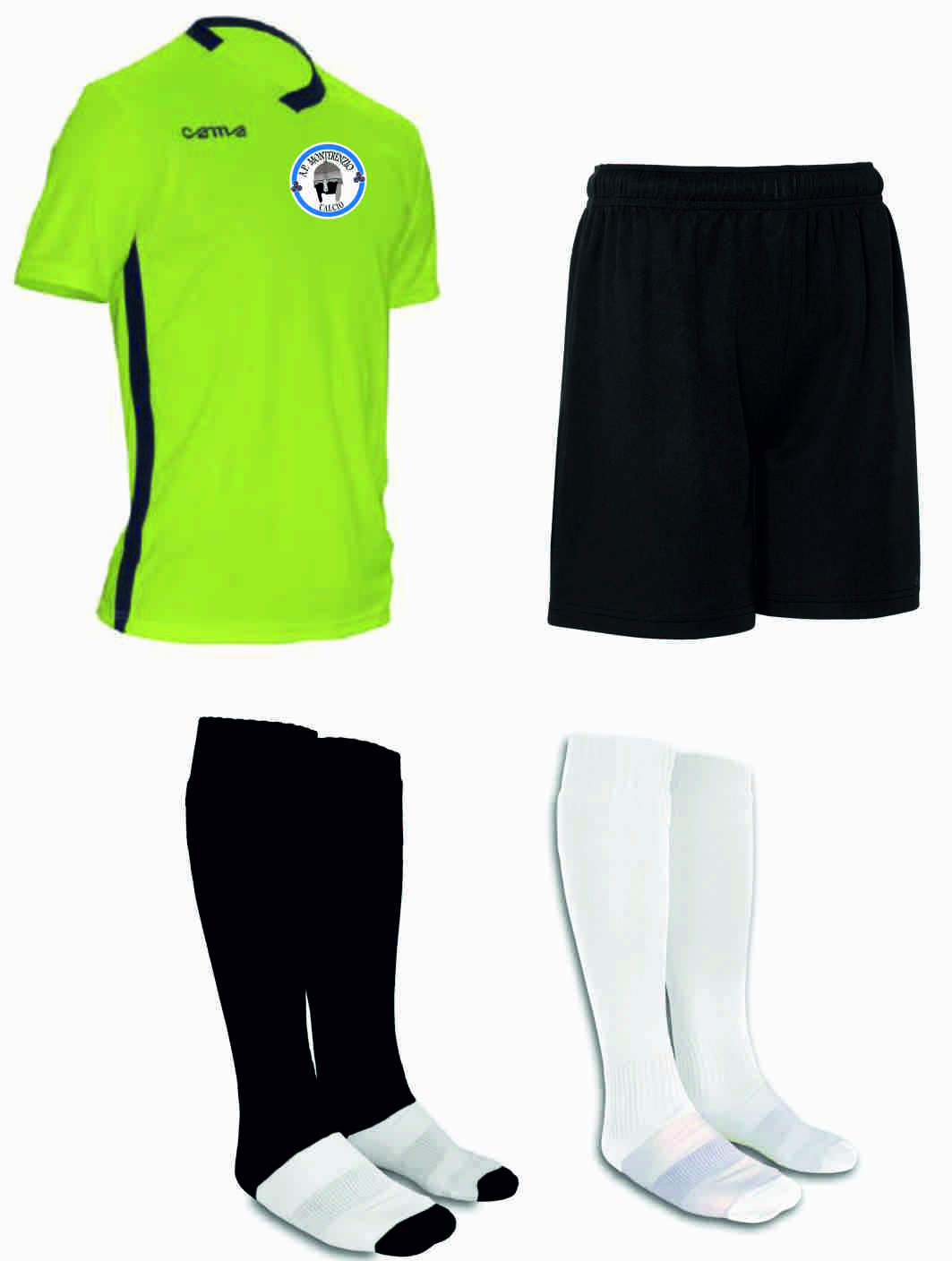 Kit estivo da allenamento composto da 2 magliette, un pantaloncino e due paia di calze di cui una nera ed una bianca Se ci sono esigenze di taglie differenti tra pantaloncino e maglietta, specificarlo nelle note dell’ordine