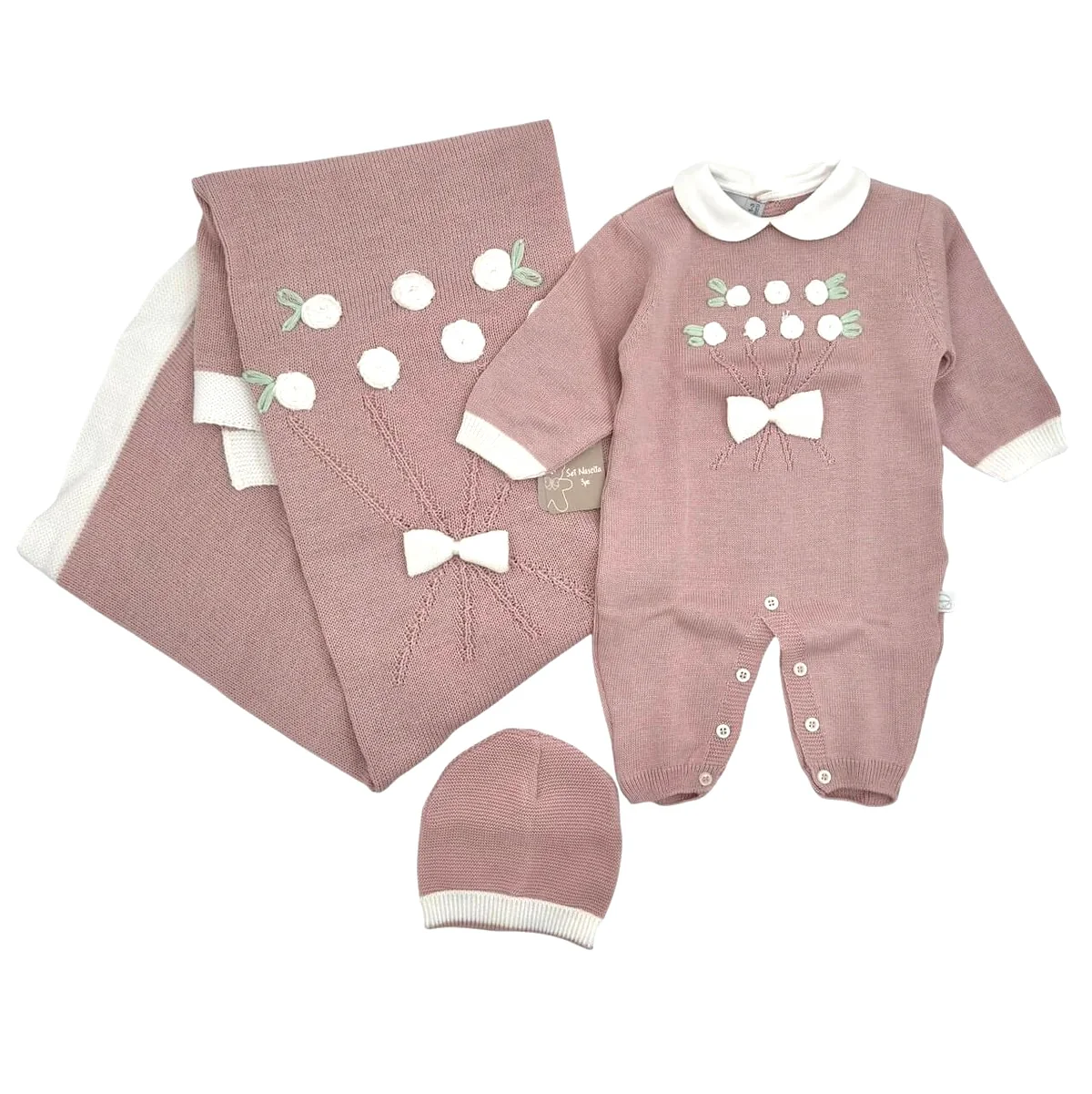 Elegante set neonato composto da tre pezzi essenziali per i primi giorni di vita. La tutina in filo garantisce massima traspirazione e comfort, ideale per mantenere la giusta temperatura corporea del bambino. Il cappellino protegge la testa delicata del neonato, mentre lo scialle in morbido filo offre versatilità per avvolgere e proteggere. Realizzato con i migliori standard qualitativi, questo set rappresenta la scelta consapevole di chi desidera capi affidabili e confortevoli per il proprio piccolo.