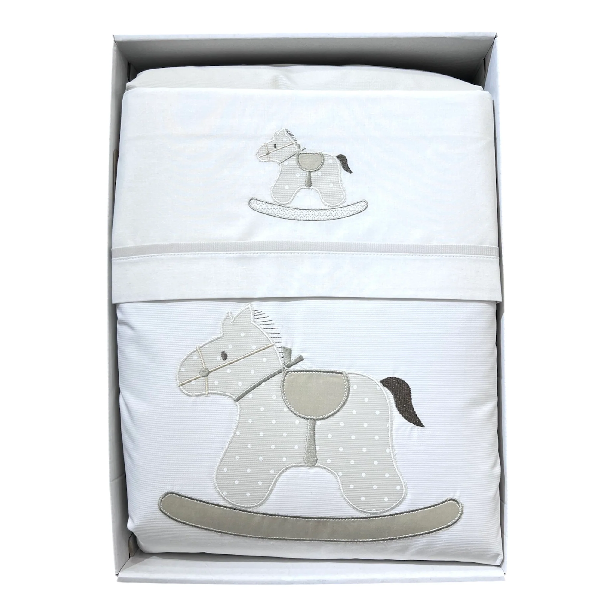 Completo coordinato per culla e carrozzina Ornella con tema Cavallo a Dondolo. Include trapunta sfoderabile, piumino, lenzuola sopra e sotto, e federa. Realizzato con tessuti di qualità per le quattro stagioni, garantisce comfort e praticità. Il design coordinato crea un ambiente accogliente e armonioso nella cameretta del tuo bambino. Perfetto per chi cerca eleganza e funzionalità in un’unica soluzione.