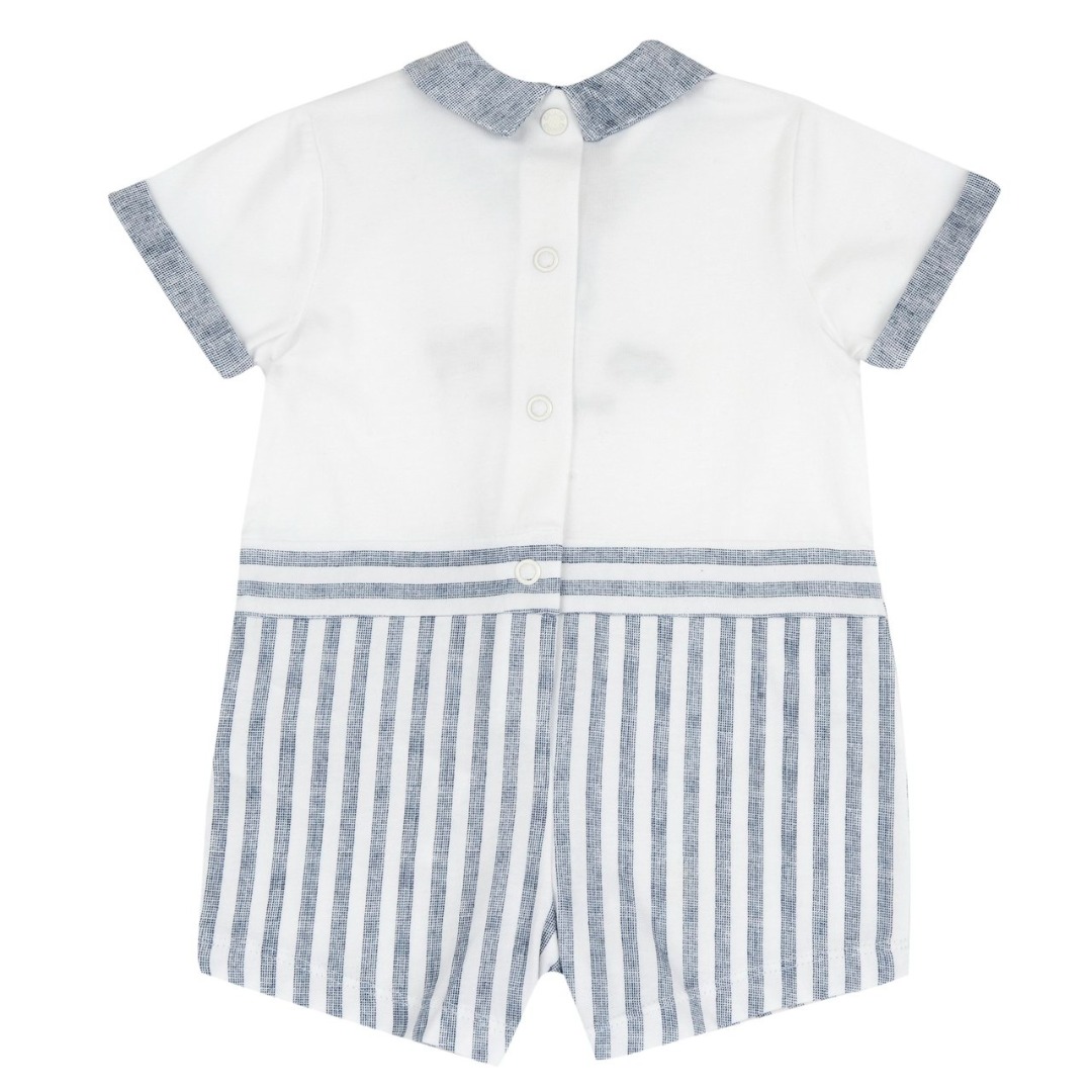Pagliaccetto manica corta in jersey di cotone elasticizzato, stampa fantasia a righe e grafica ricamata.