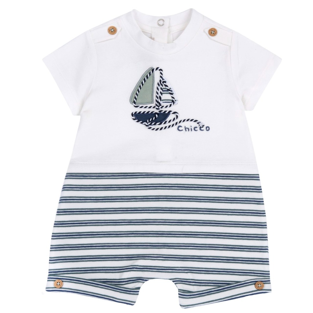 Pagliaccetto manica corta in jersey di cotone elasticizzato, tessuto tinto filo rigato.