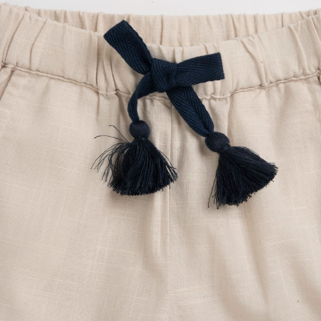 Pantaloni lunghi in tessuto di cotone effetto lino, fiocco in gros grain con nappine e nastro traforato insertato al fondo gamba
