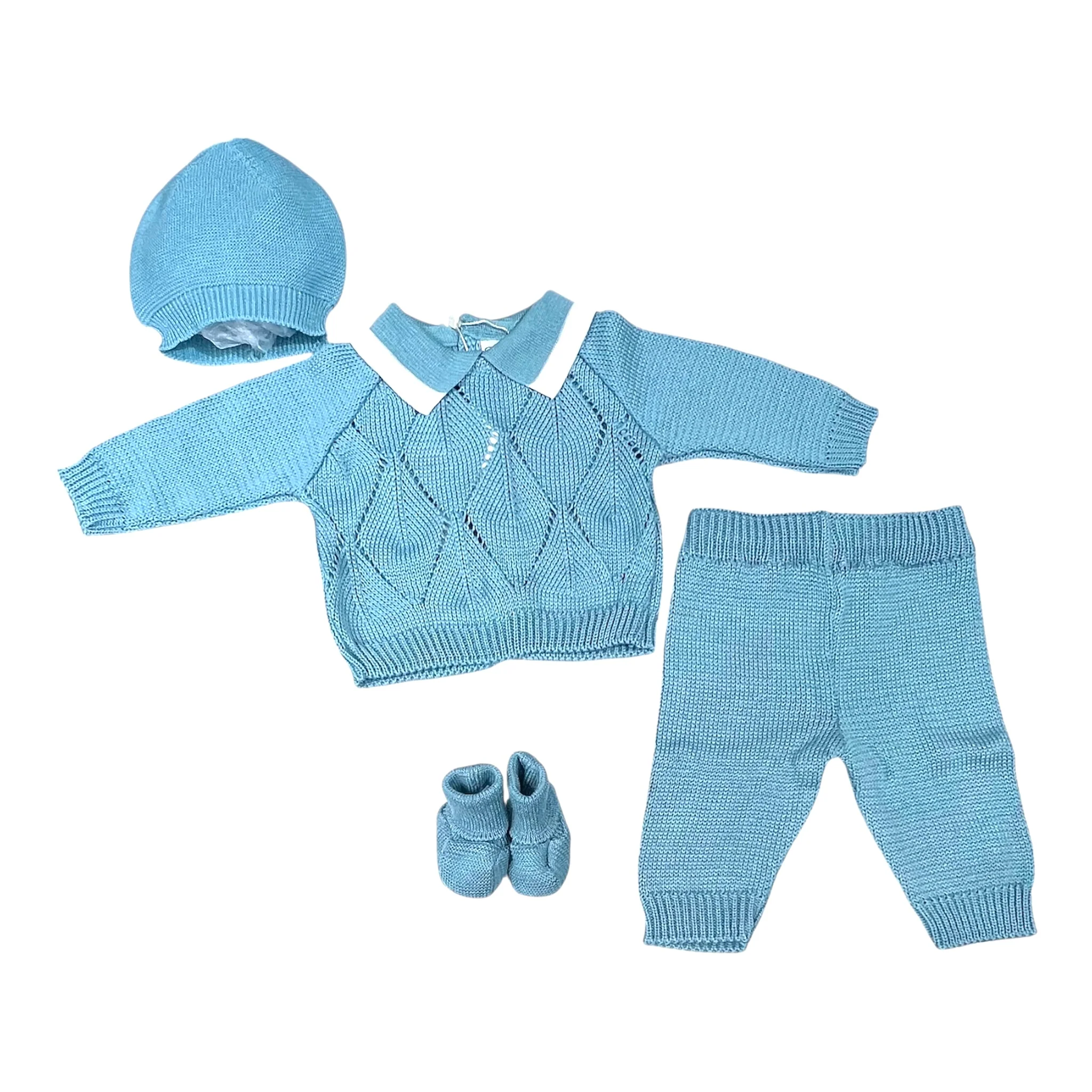 Completo Pappa e Latte nascita elegante e pratico per i primi mesi del tuo bambino. Realizzato in morbido filo. Il colore ottanio delicato si abbina perfettamente a qualsiasi ambiente della nursery. Tessuto di qualità, facile da lavare e resistente nel tempo. Ideale come regalo speciale per i neo-genitori.