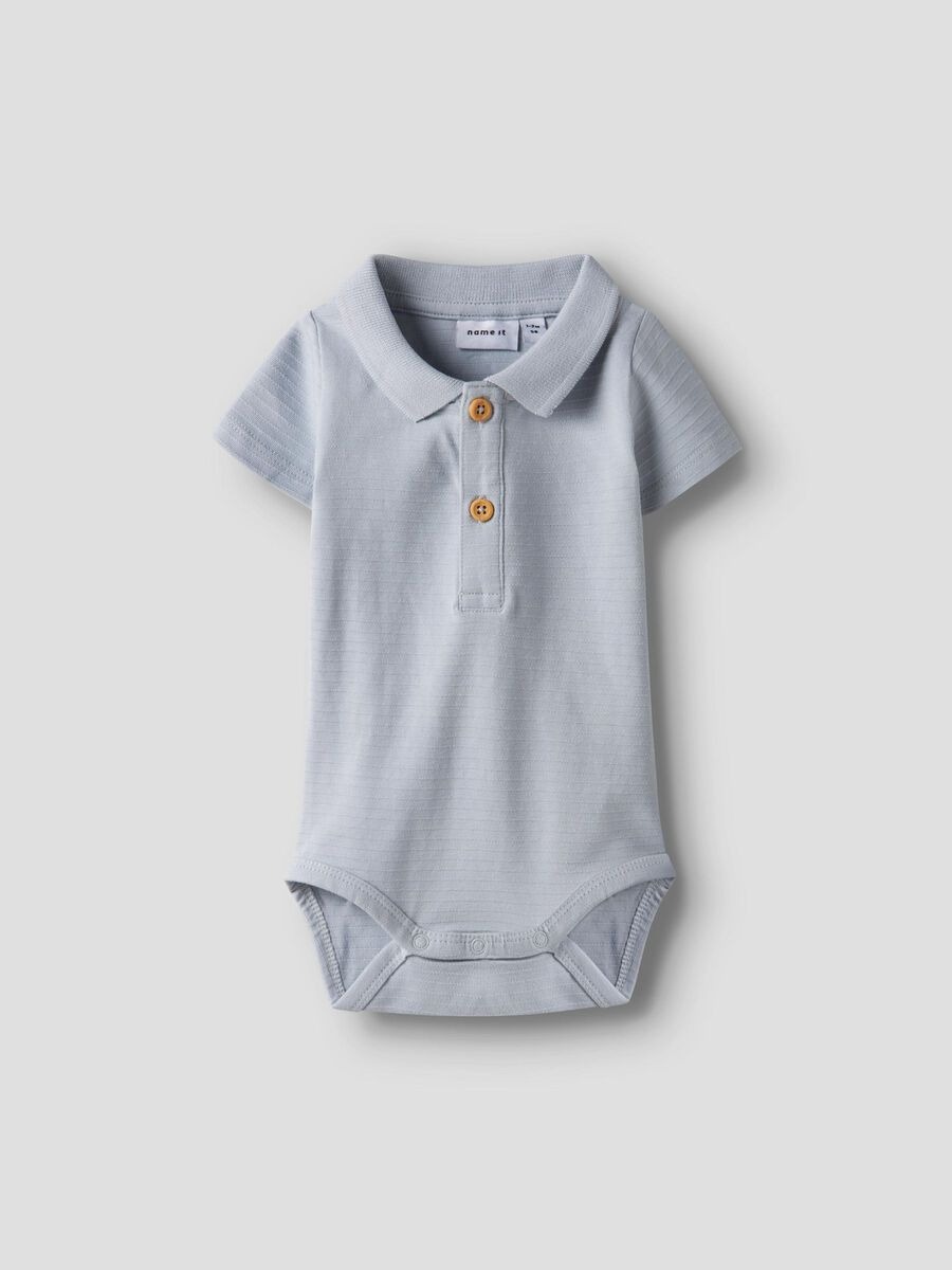 Polo body a manica corta di colore celeste con trama a costine. Colletto classico con dettaglio rigato, bottoni ad asola sul davanti e pratici bottoni automatici sul cavallo. Morbido, confortevole e piacevole sulla pelle.