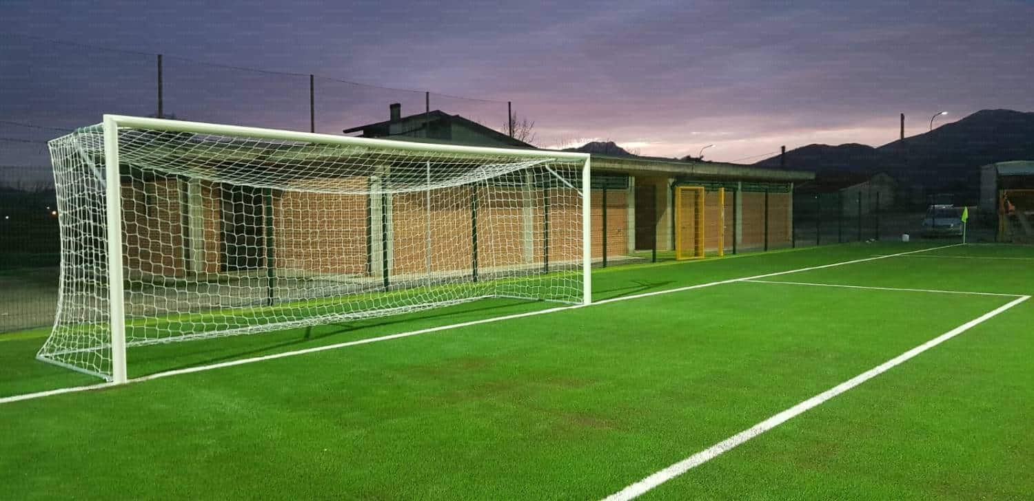 Coppia porte da calcio regolamentare 7.32×2.44 metri certificate UNI-EN 748, realizzate con profilo in alluminio sezione ovale 100×120 mm. con nervature interne. Per rendere la porta ancora più stabile e robusta i gomiti sono saldati e le giunzioni sono in profilo ad alto spessore in alluminio lega speciale 6005. Una volta montata la porta, la traversa rimane parallela al […]